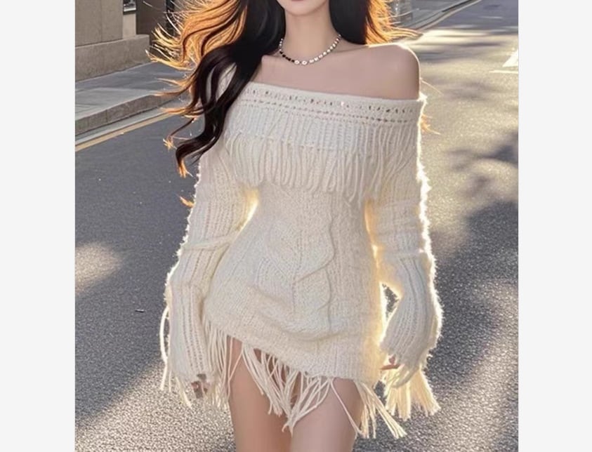 オフショル ニットワンピ 秋冬新作 フリンジミニワンピ 杏色 韓国ガーリー 大人可愛い