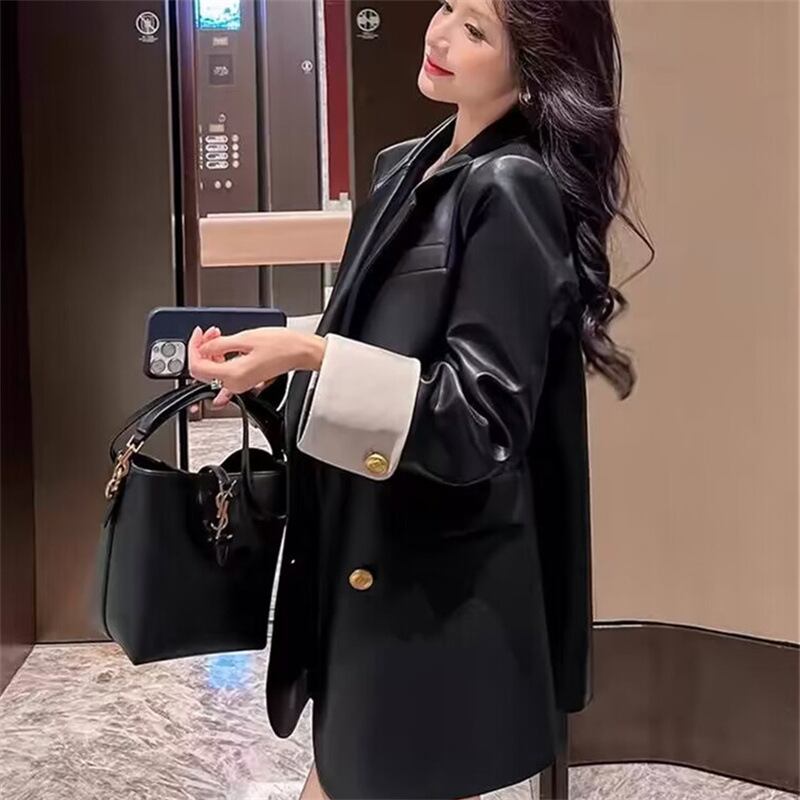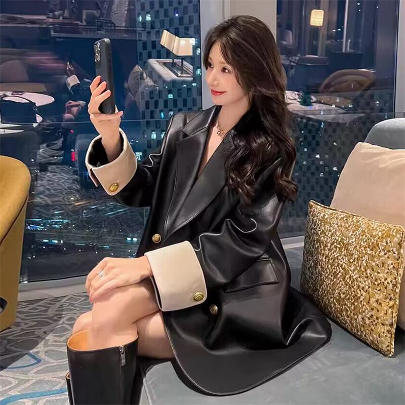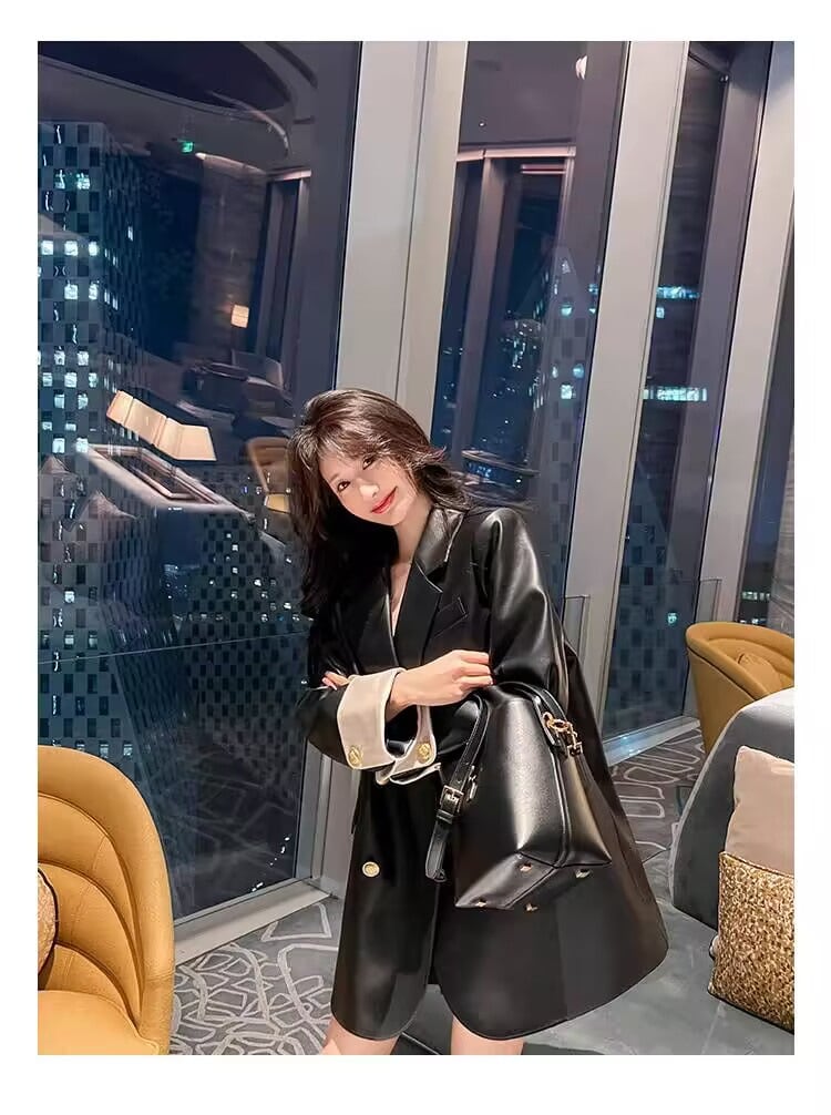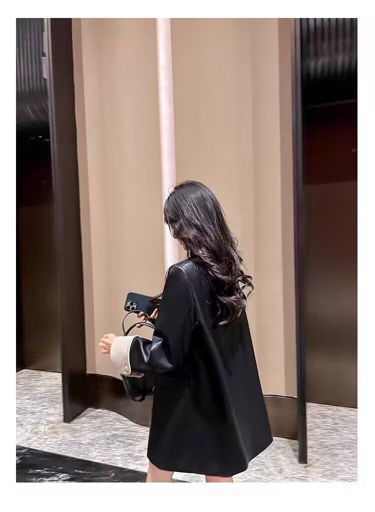 韓国ストリート風 ゆるシルエット レザージャケット 黒 中長丈 アウター