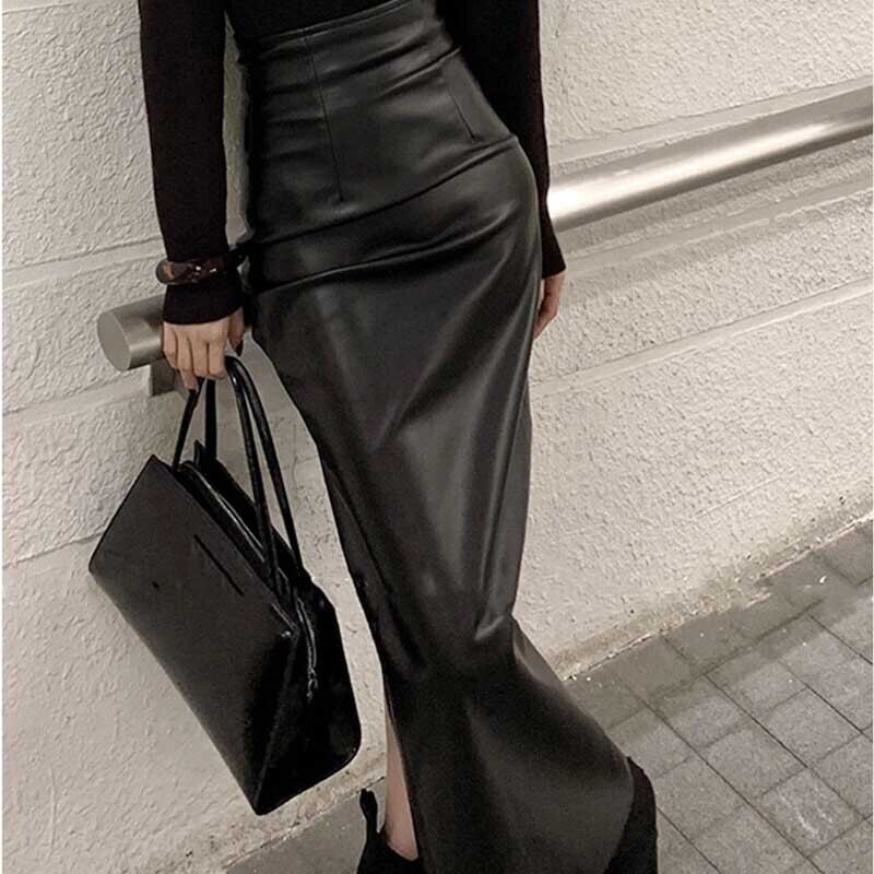 大人ギャル PUレザー スカート ミディ丈 タイトスカート ハイウエスト ブラック 2025秋冬 新作 レディース 皮スカート セクシー 韓国風 コーデ