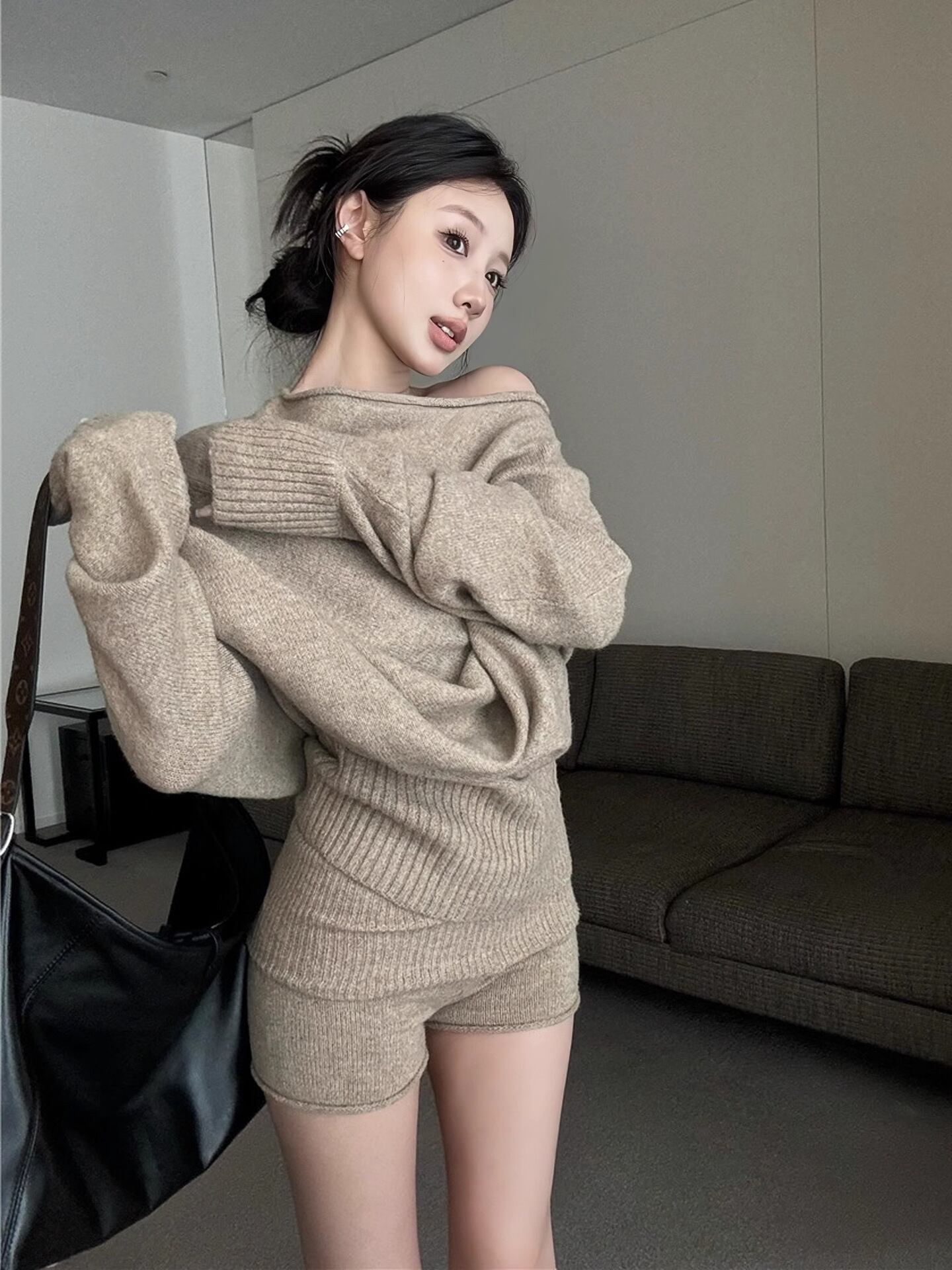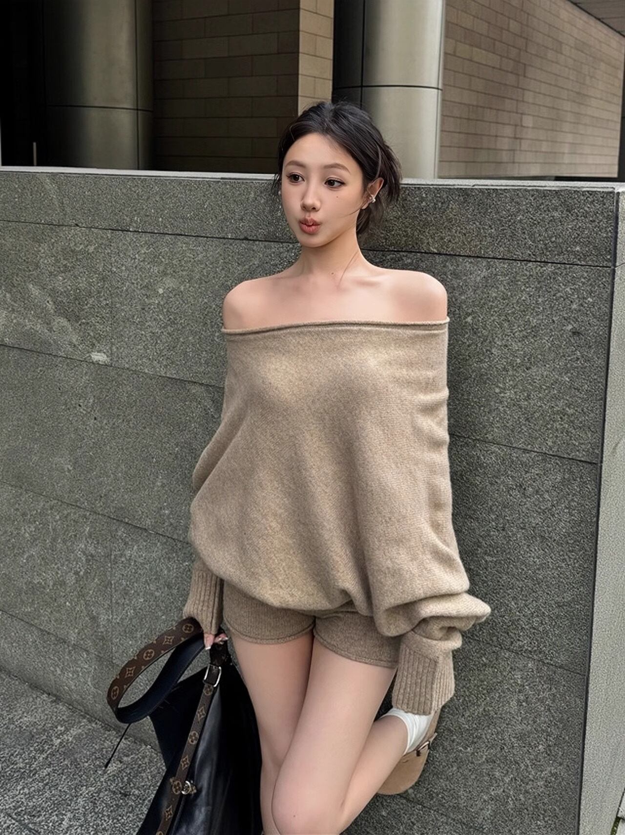 クーポン配布中!実質送料無料になる800円OFFクーポン!決済前にクーポンコード:XMAS800を入力してお得にGetしてね!抜け感のある斜めオフショルダーニットと、カジュアルなショートパンツのセットアップ。