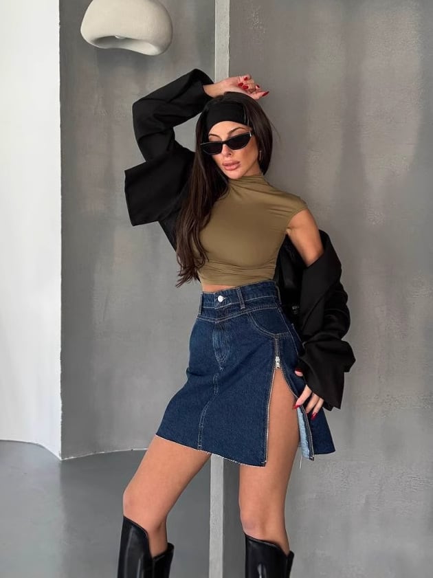 個性的な不規則カットとフロントジップがアクセントになり、ストリート感のあるスタイルを演出します。
