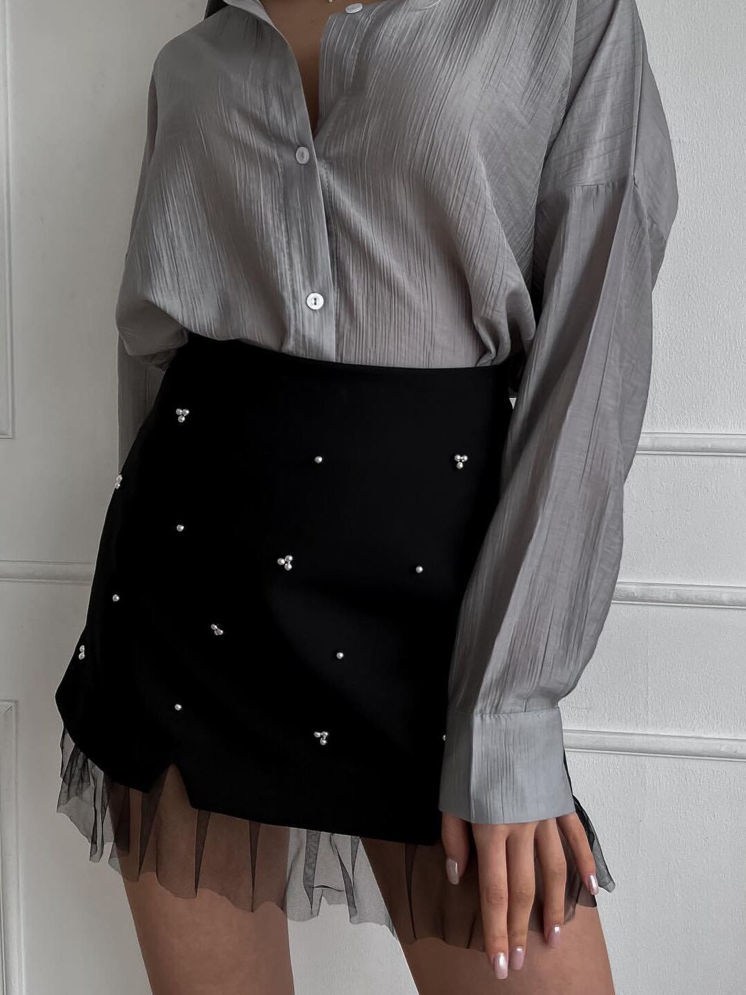 ブラックレース ミニスカート|フェイクレイヤード風 ビジュー付き Aライン