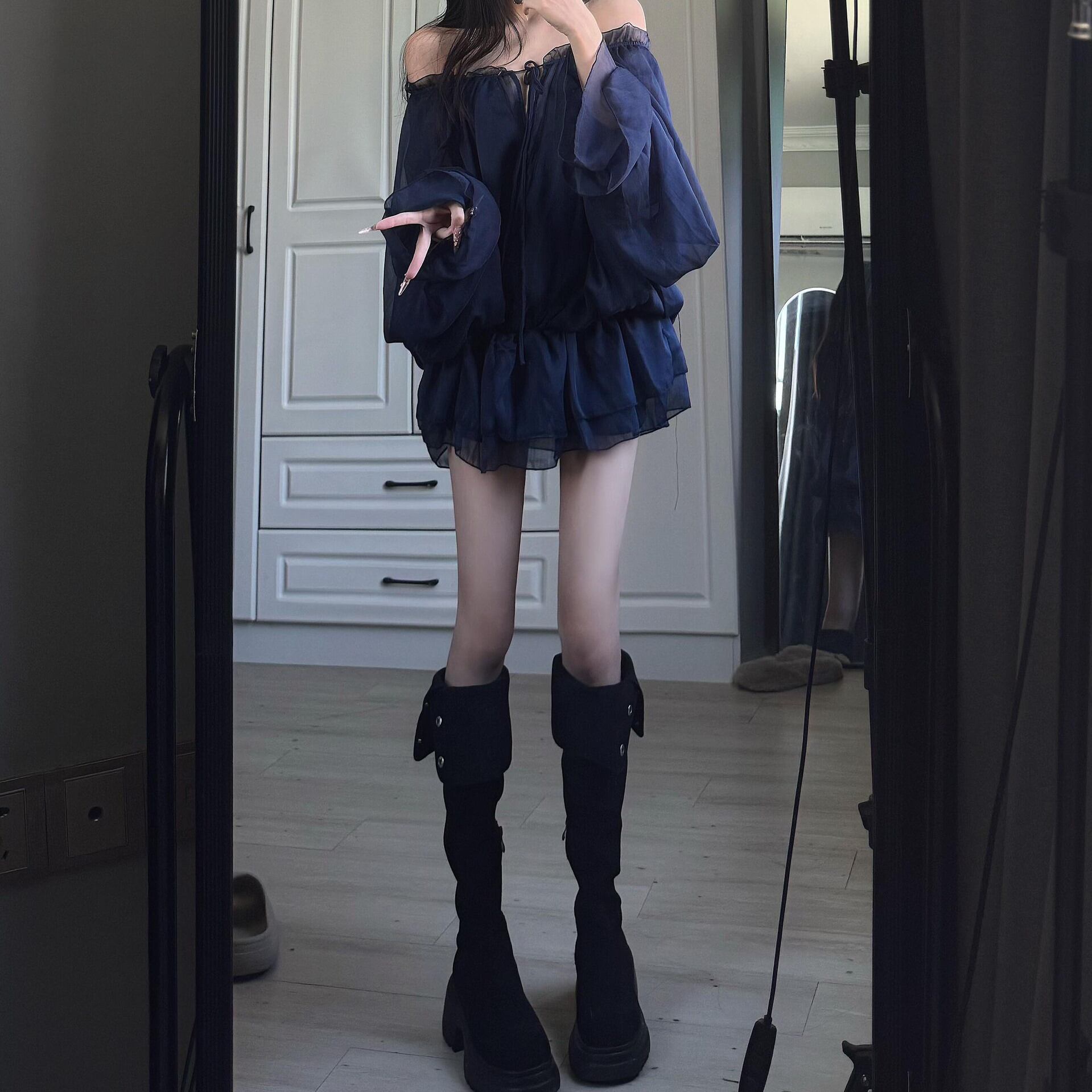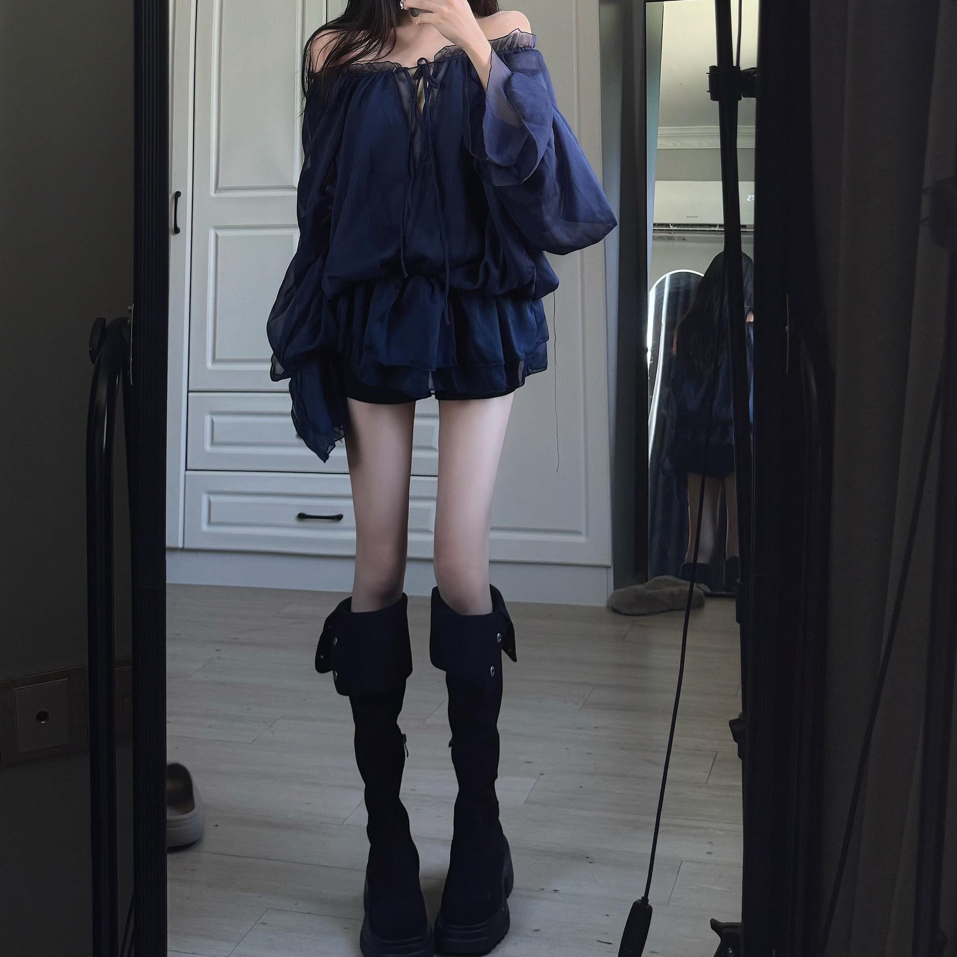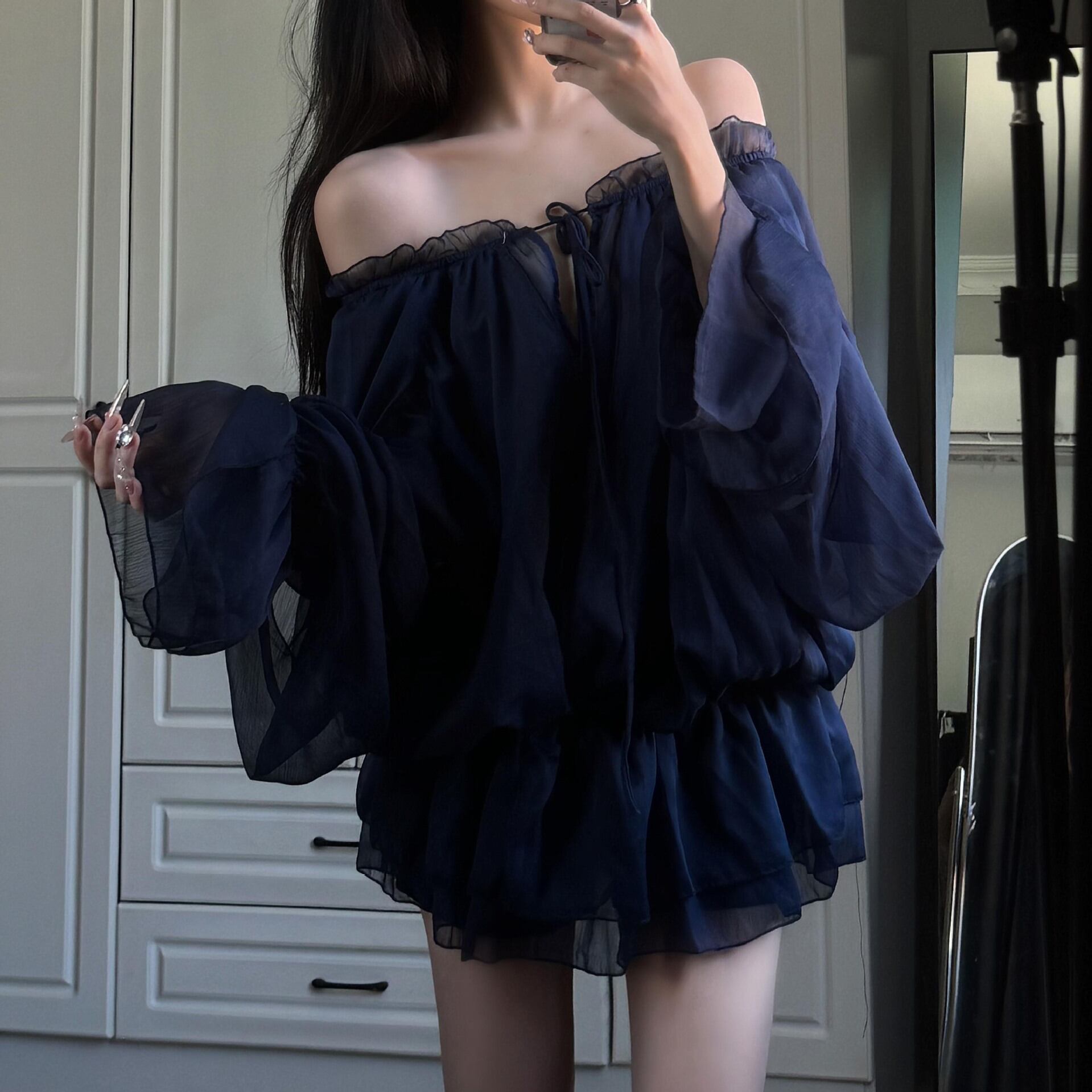 オフショルダー フリルブラウス 長袖 シフォン シャツ トップス レディース ブルー 初秋コーデ 甘辛フェミニン