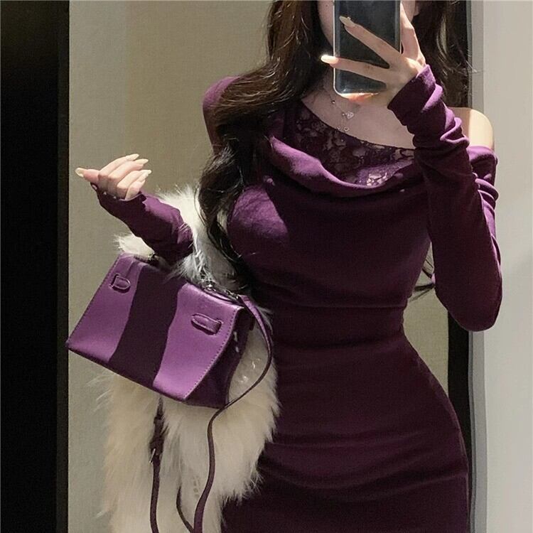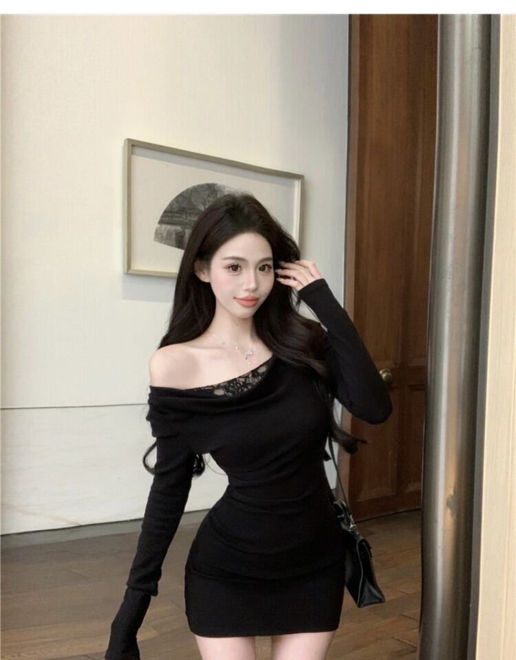 黒 レース切り替え ミニワンピース 長袖 タイト 高見え 秋新作