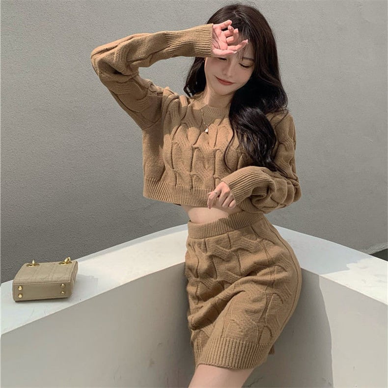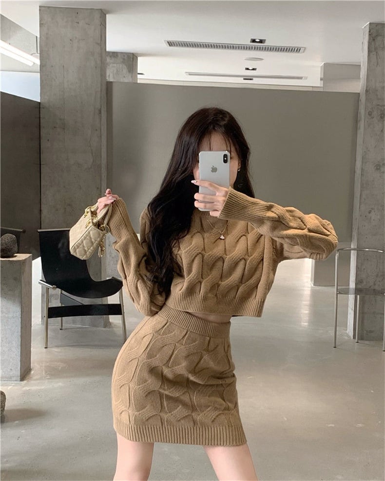 ニット セットアップ 2点セット 秋冬新作 ショート丈トップス + タイトスカート 着痩せ 大人可愛い