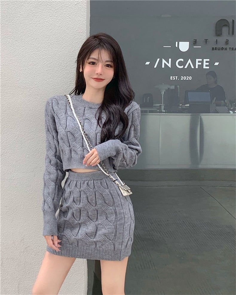 ショート丈のニットトップスとタイトシルエットのスカートが、スタイルをすっきり見せてくれるセットアップです。