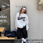 フロントの大きめロゴプリントがコーデの主役になり、1枚でトレンド感のあるスタイリングに仕上がります。