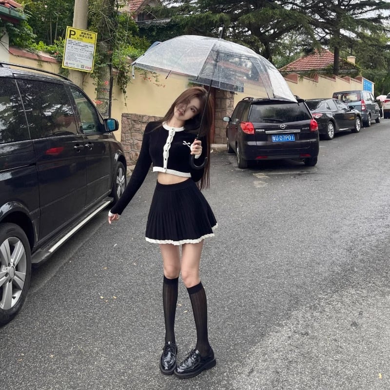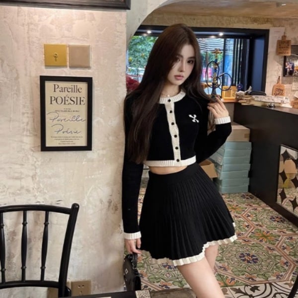 カーディガンとプリーツスカートの2点セットで、着るだけで華やかなコーデが完成します。