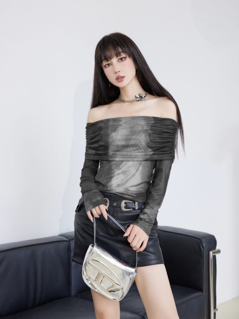 ギャル映え オフショル長袖トップス 網メッシュ切替 スリムタイト 美シルエット 黒 セクシー