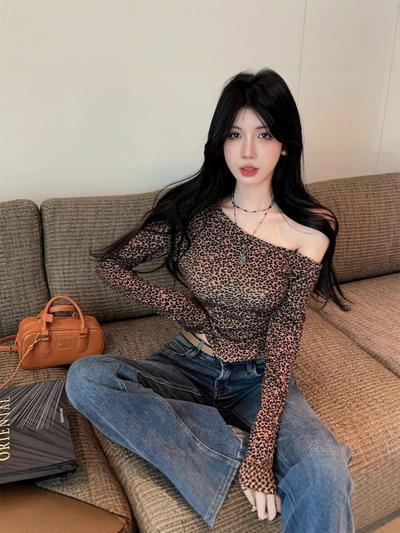 秋冬マストの「德?素材」を使用した保温性◎のロンT。トレンドの豹柄プリントに斜めネックラインで、ちょっぴりセクシーな肌見せが叶います。