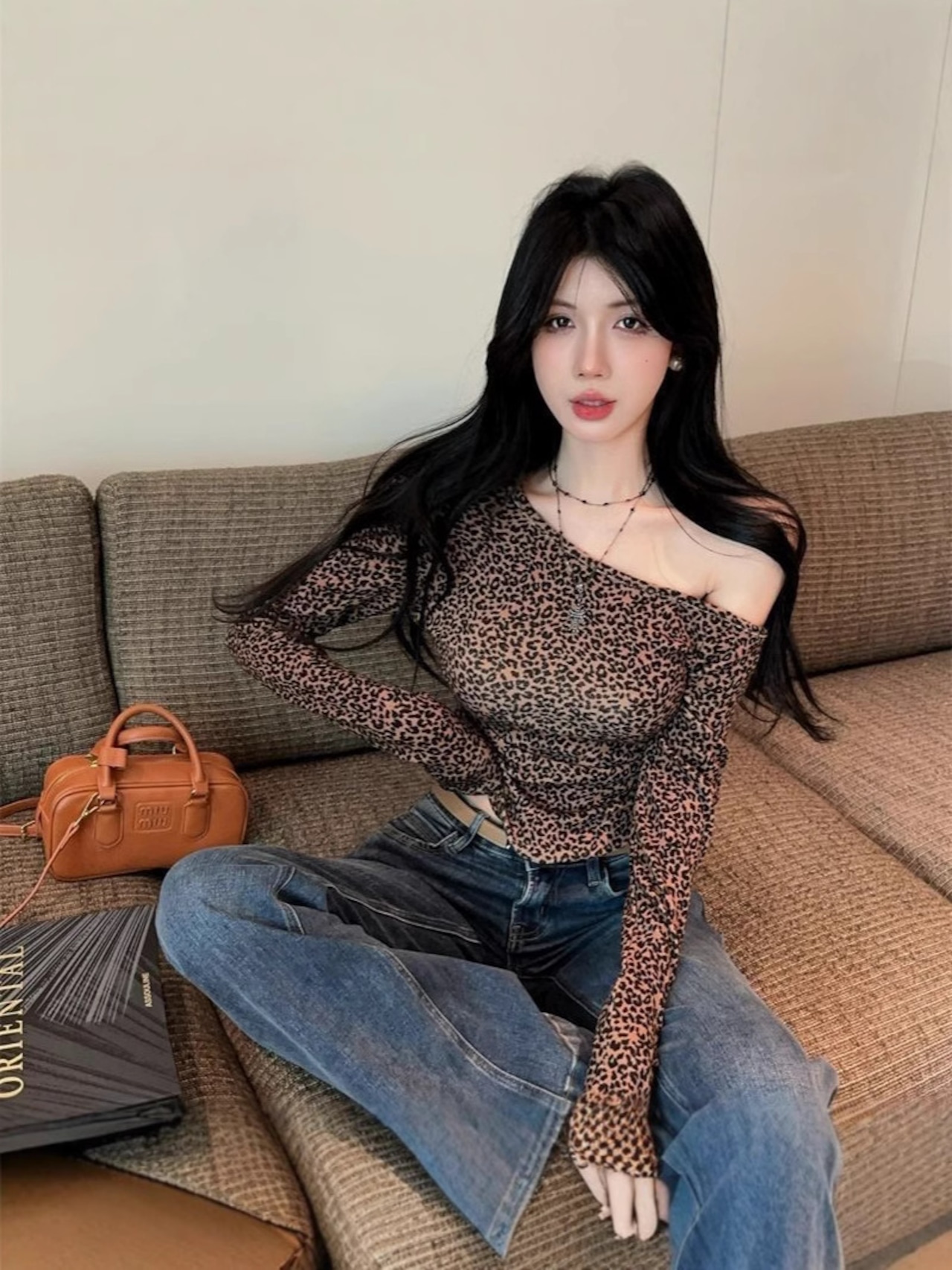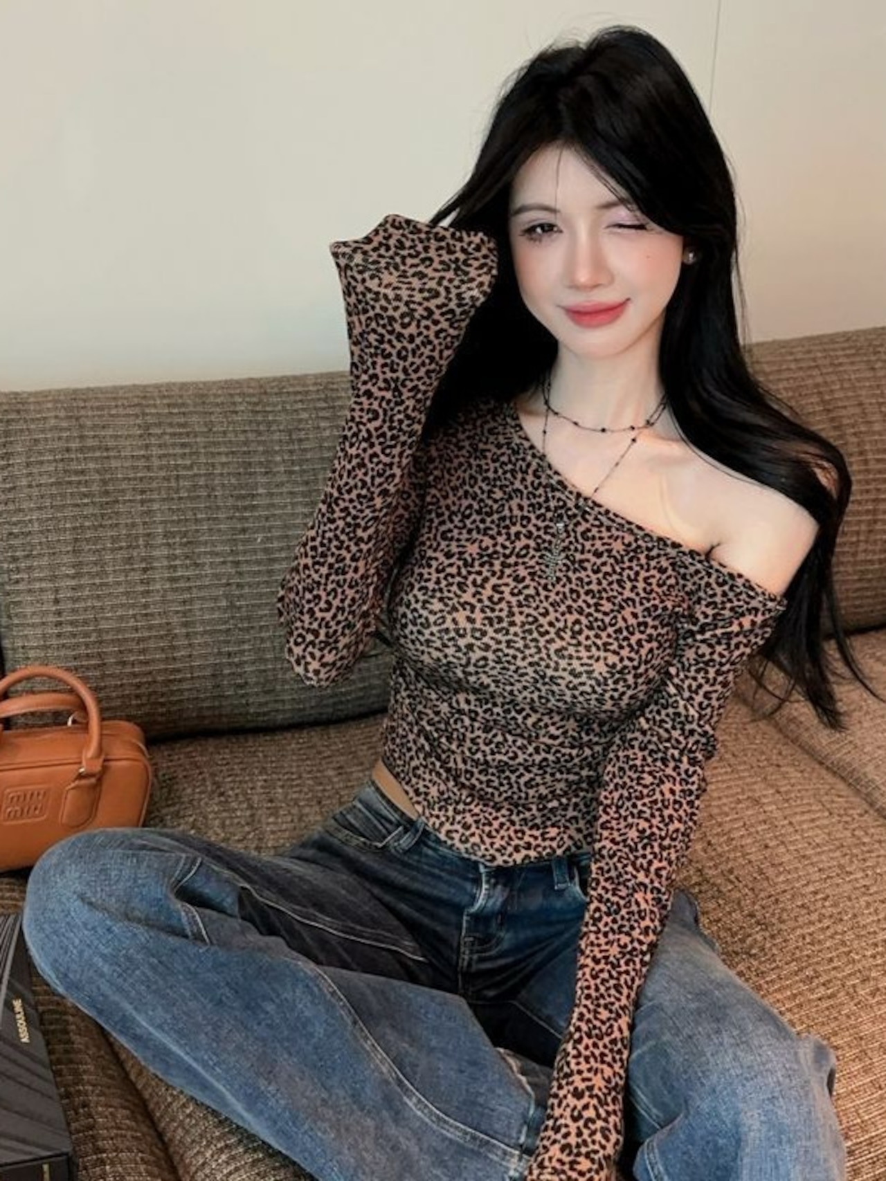 秋冬マストの「德绒素材」を使用した保温性◎のロンT。トレンドの豹柄プリントに斜めネックラインで、ちょっぴりセクシーな肌見せが叶います。
