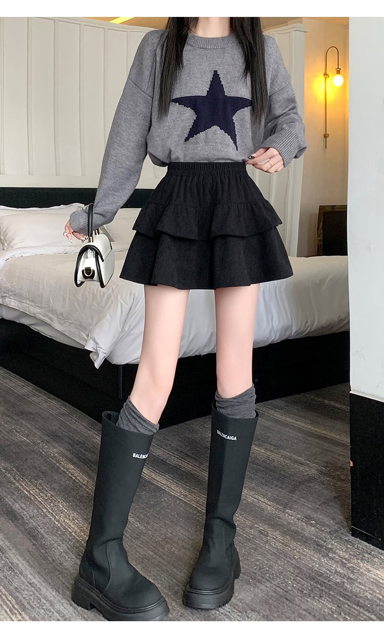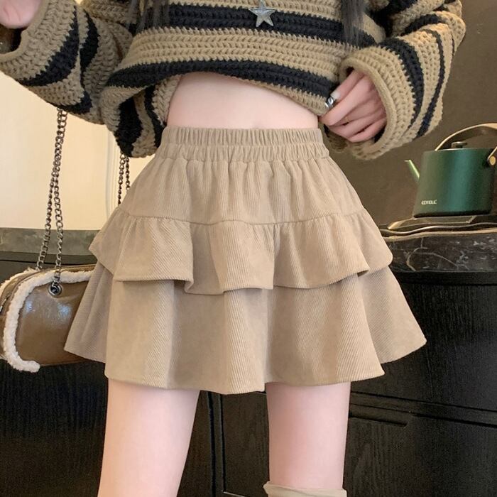 コーデュロイ ミニスカート レディース フリル Aライン 高腰 脚長効果 秋冬 ギャル 量産型 韓国 ガーリー かわいい ブラック