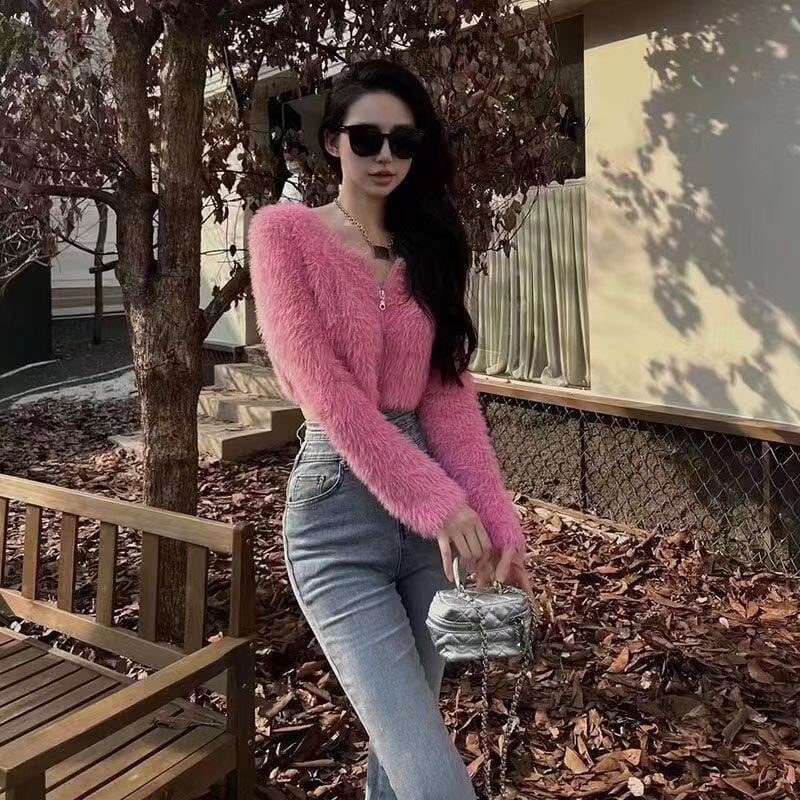 韓国風 ニットカーディガン レディース 新作 ショート丈 ジップアップ 長袖 ふわもこ ニットセーター
