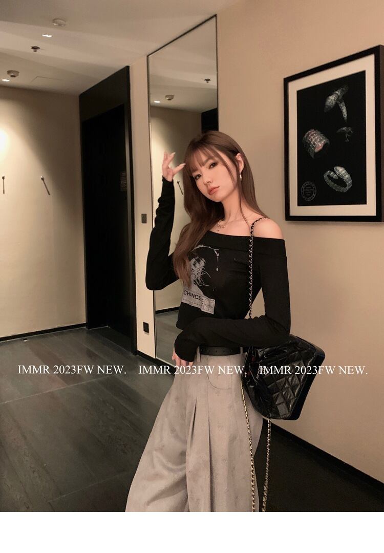 黒 3Dプリント オフショルダー カットソー 長袖トップス|秋冬新作|甘辛ストリートスタイル
