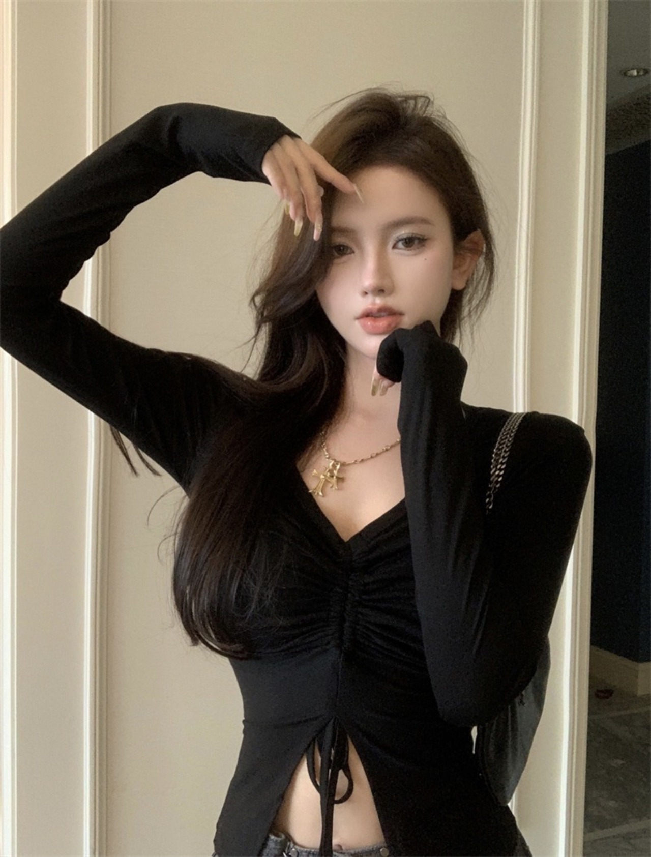 Vネック 抽しぼりトップス 長袖 ショート丈 リブカットソー フレアスリーブ くびれ見せ 韓国風 ギャル系 大人フェミニン 秋新作 ブラック