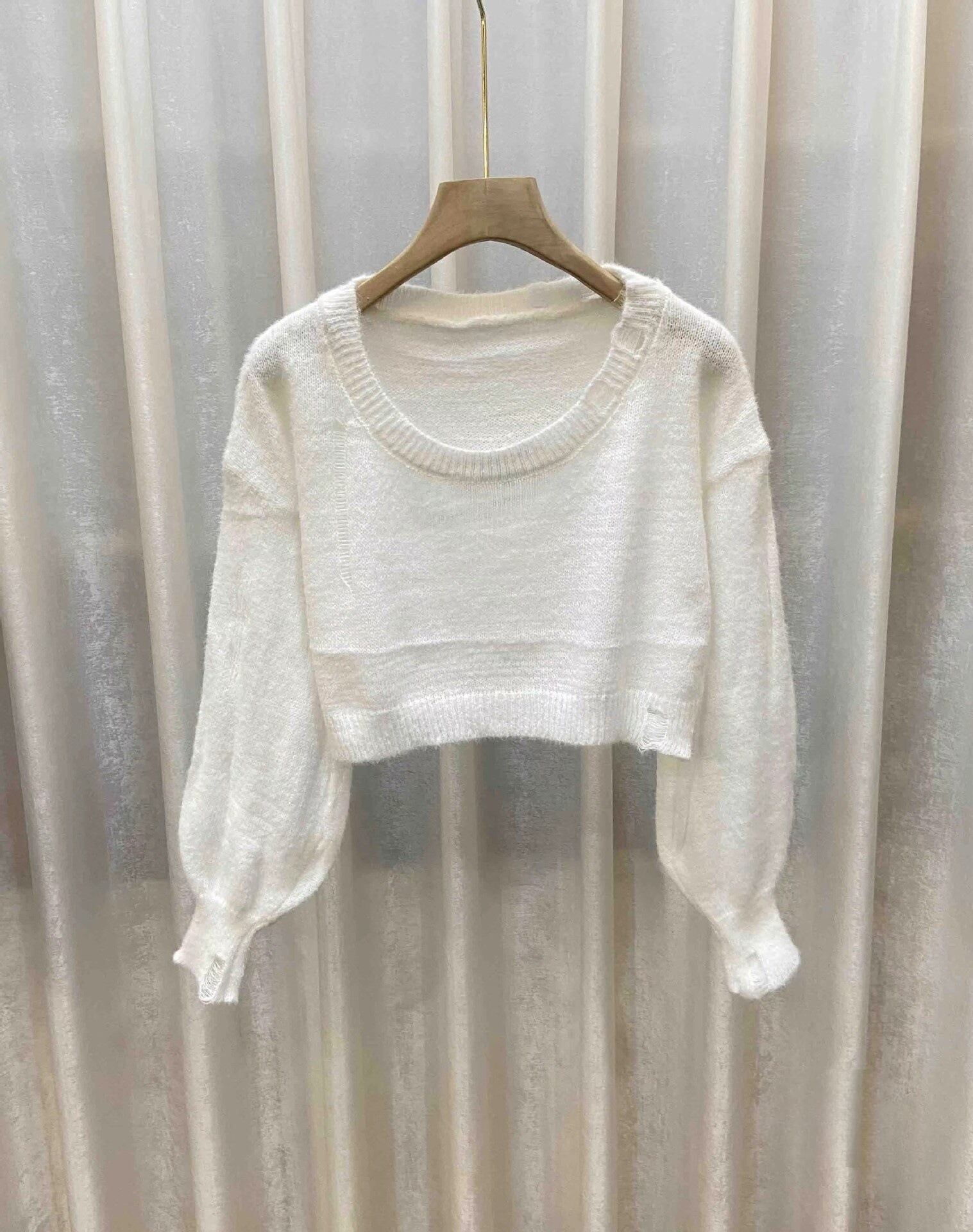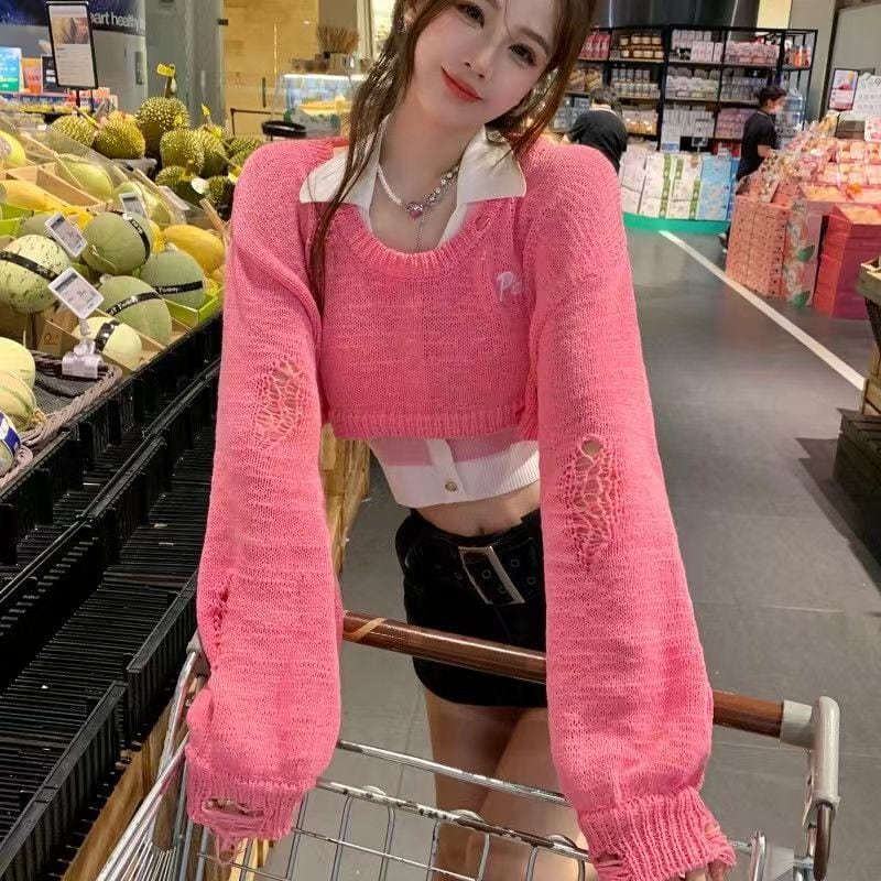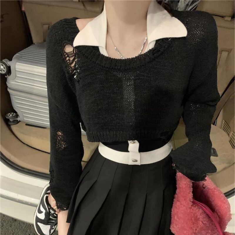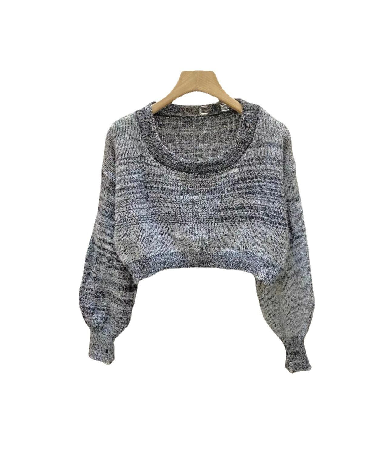 韓国風 透かし編みニットトップス レディース 秋冬 クロップド ダメージ風 ショート丈 長袖 セクシー