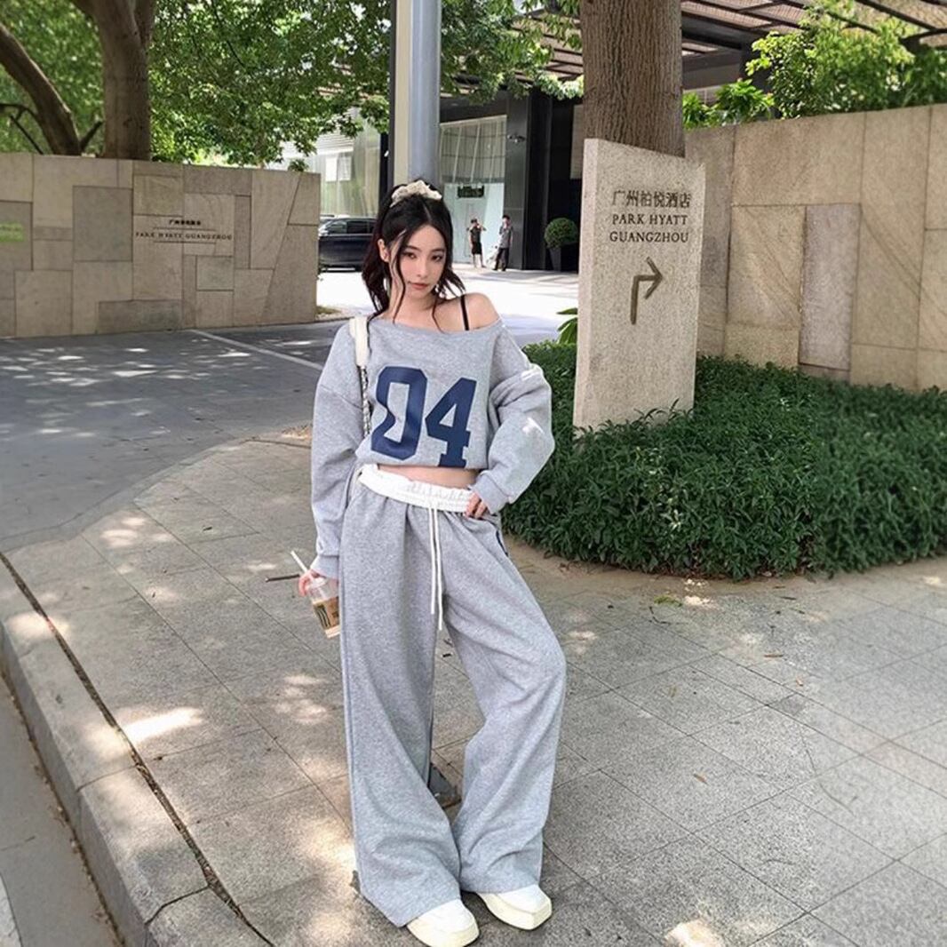 ロゴプリント ワイドパンツ レディース スウェットパンツ 美式レトロ ゆったり ルーズ ストレートパンツ 長ズボン カジュアル 体型カバー 秋冬 韓国風 グレー