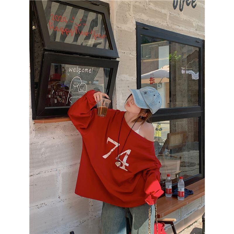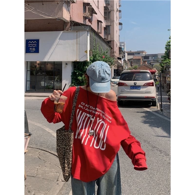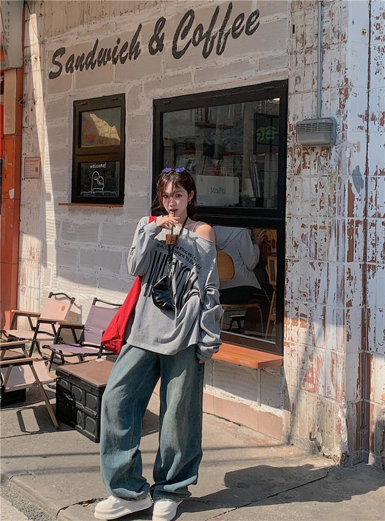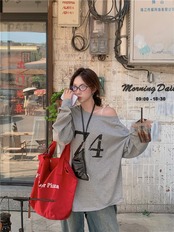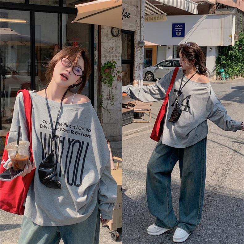 秋新作 スウェット レディース オフショルダー レトロ 英字ロゴ トレーナー ゆったり 美式ヴィンテージ 露肩トップス 大人ガーリー グレー