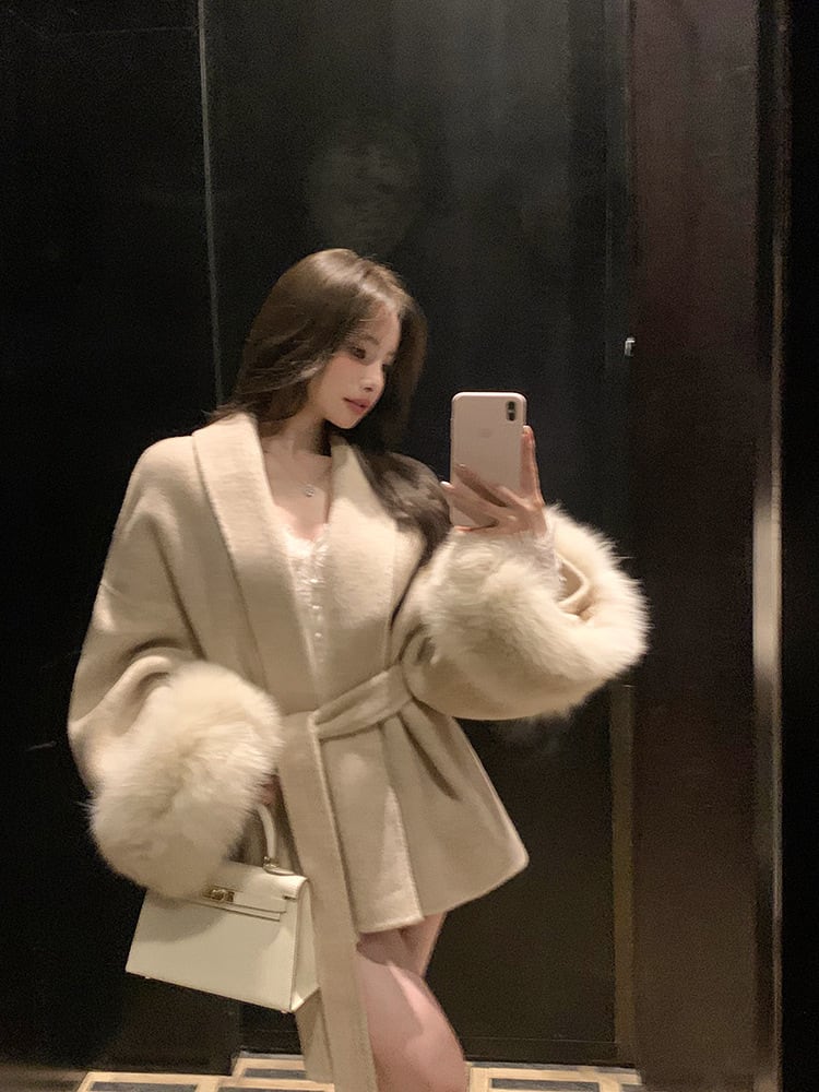 クーポン配布中!実質送料無料になる800円OFFクーポン!決済前にクーポンコード:XMAS800を入力してお得にGetしてね!ふわっとした袖のフェイクファー×ウエストリボンがポイントの大人可愛いミドル丈コート。