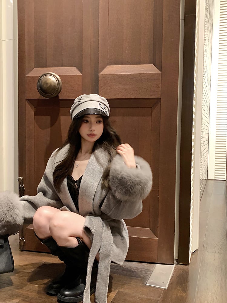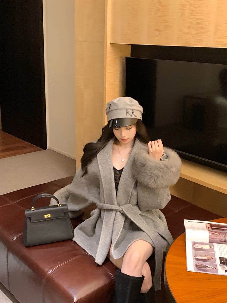 秋冬新作 ウールコート レディース フェイクファー袖 ベルト付き ジャケット ミドル丈 アウター 上品 通勤 ガーリー グレー