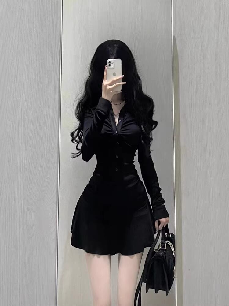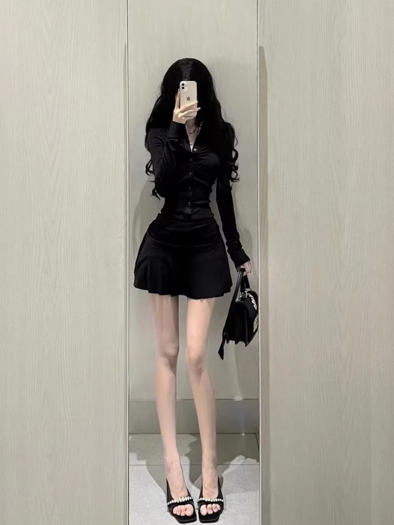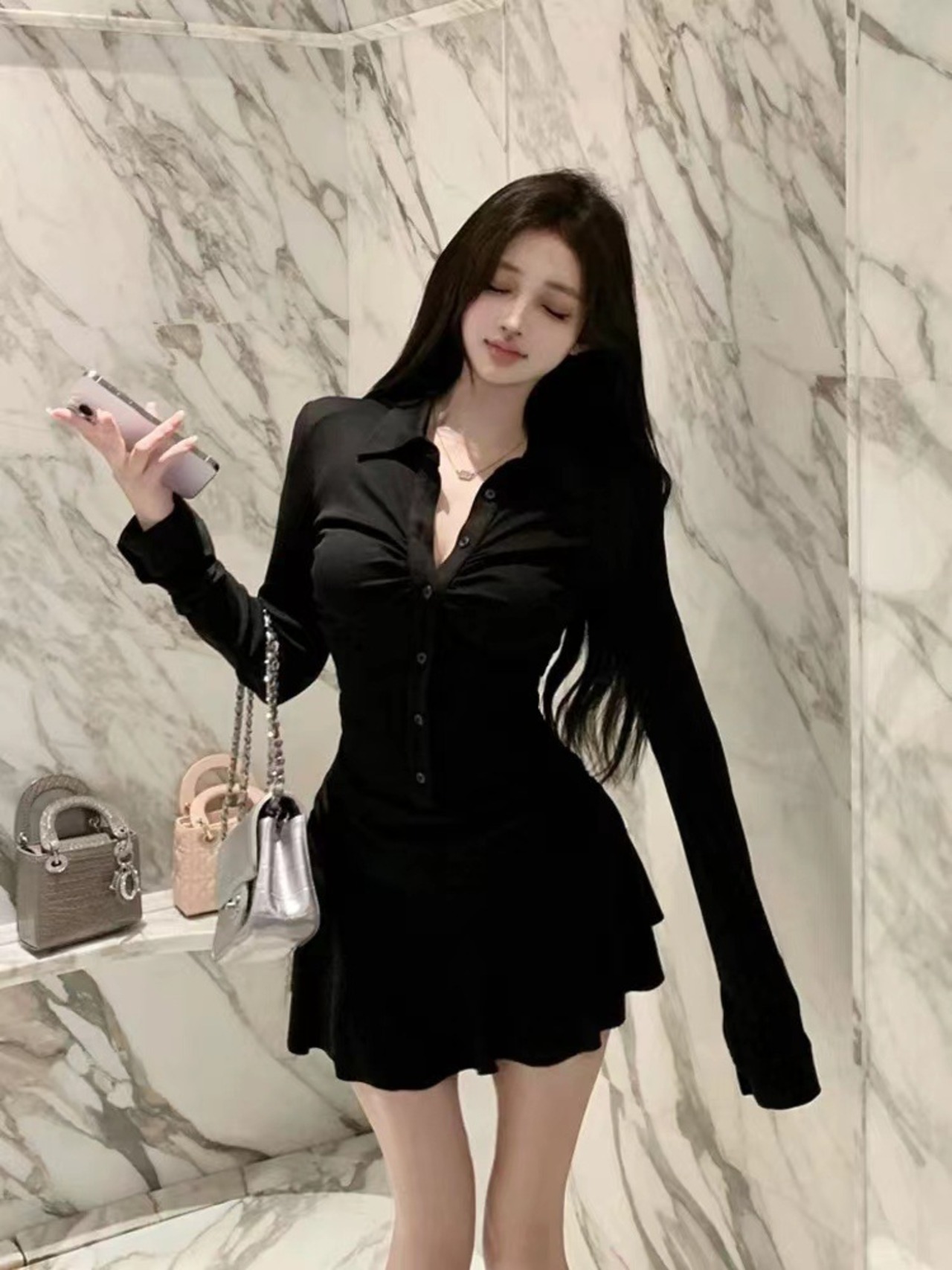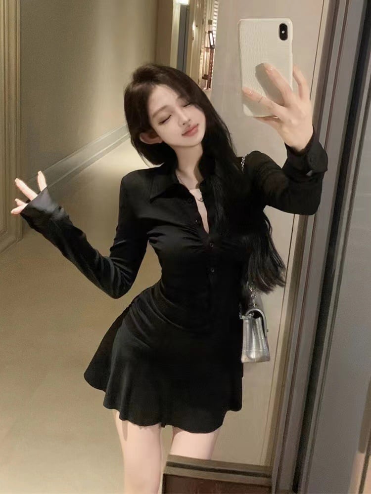 シャツワンピース レディース 秋新作 短丈 Aライン POLO襟 長袖 ウエストマーク フレア ミニワンピ 美脚 きれいめ カジュアル ブラック