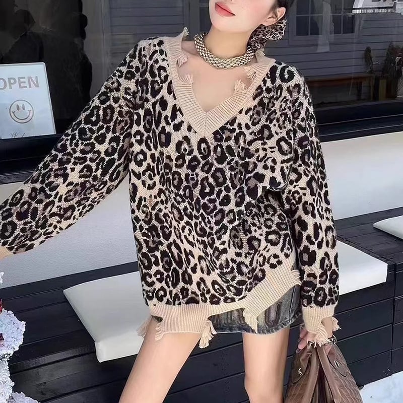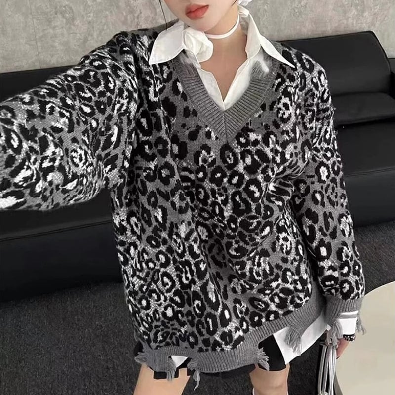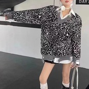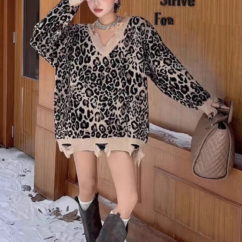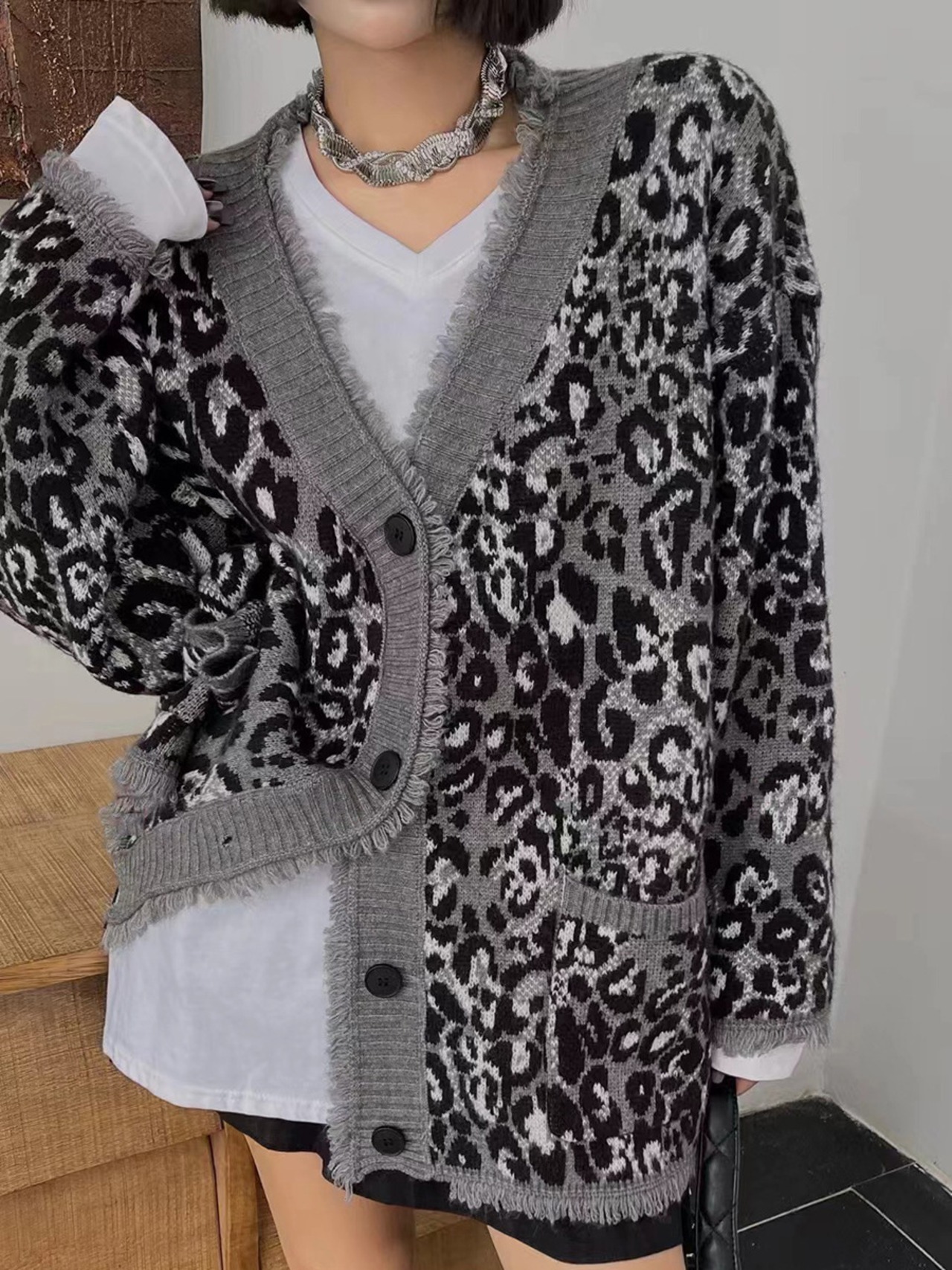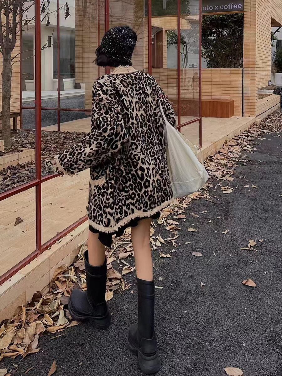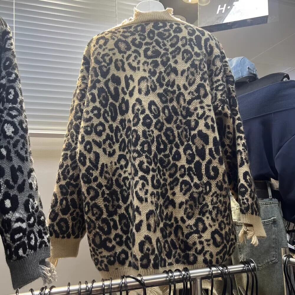 【海外ガール風】レオパード柄ニットカーディガン 秋冬新作 ルーズシルエット 厚手 Vネック アニマル柄 トレンドコーデ