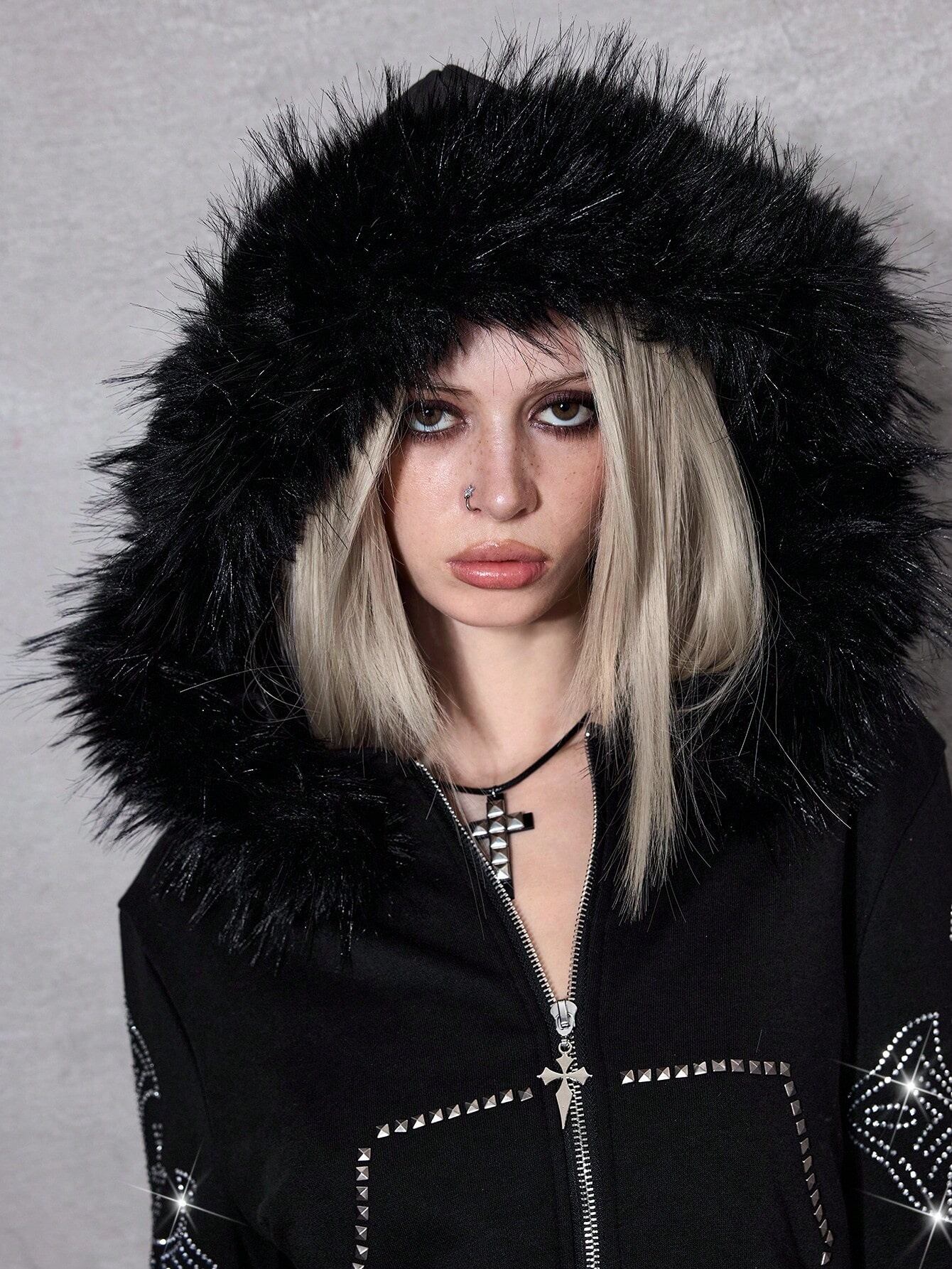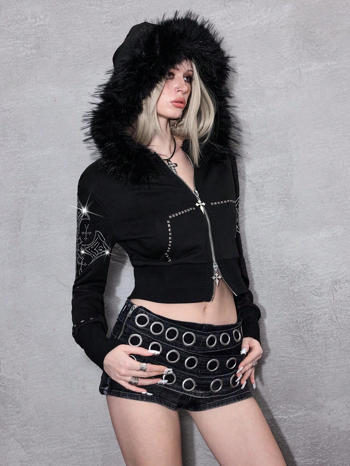 Y2K ジップパーカー レディース 秋新作 ショート丈 フェイクファー ストーンロゴ ジャージ素材 フーディ スリムフィット ストリート系
