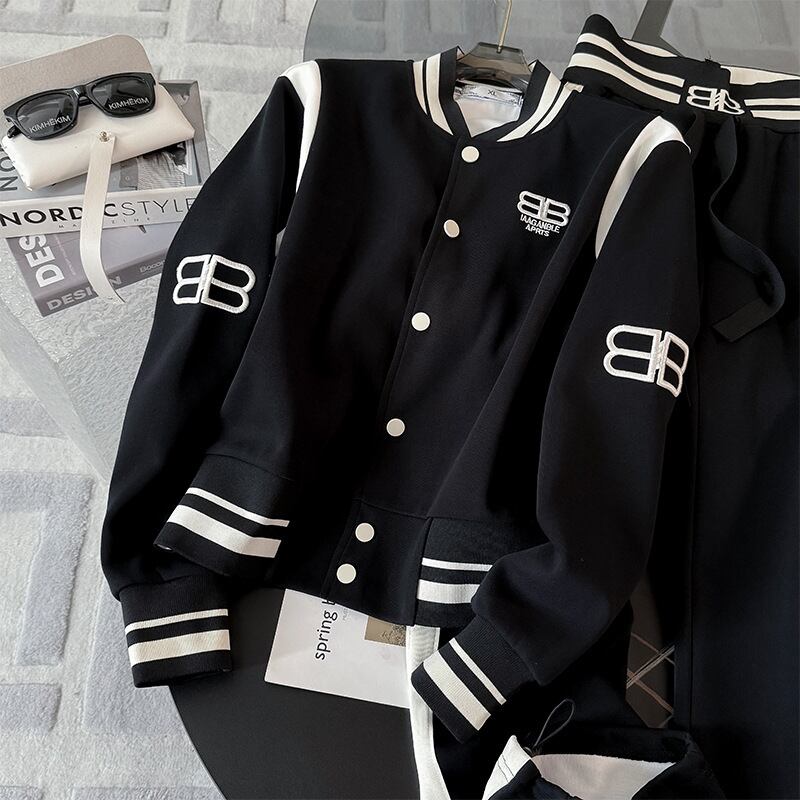 トップスはトレンド感のある**スタジャン風デザイン(棒球ジャケット風)**で、