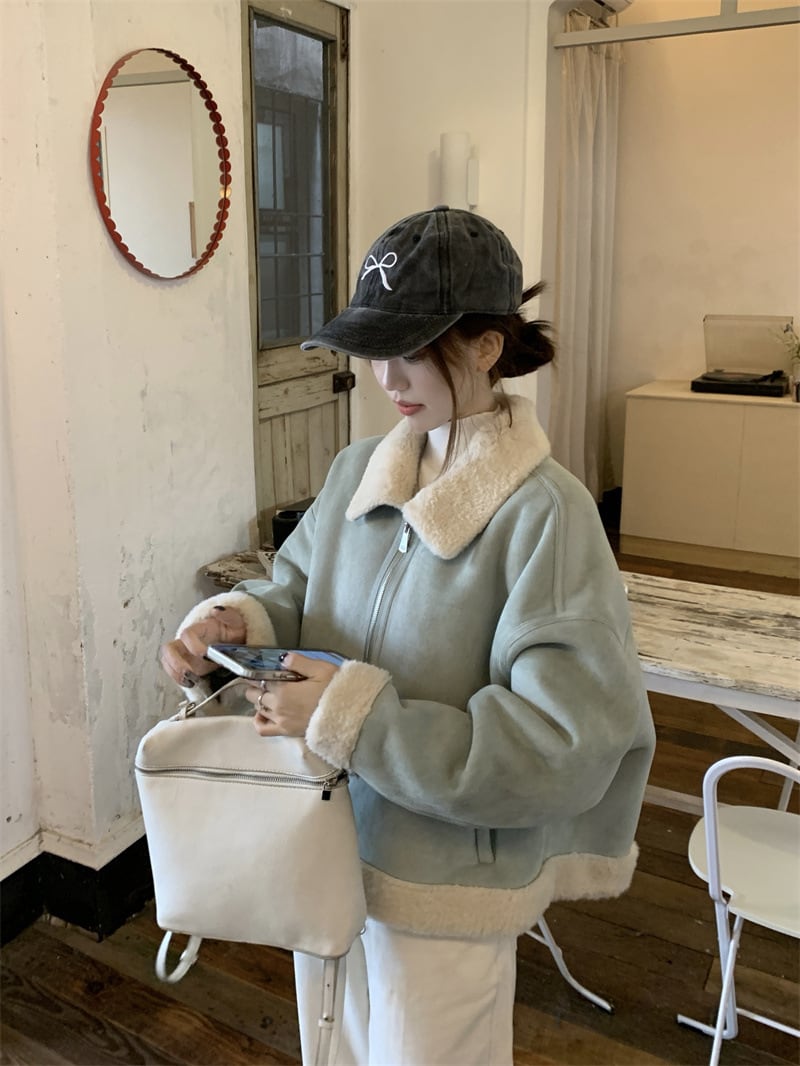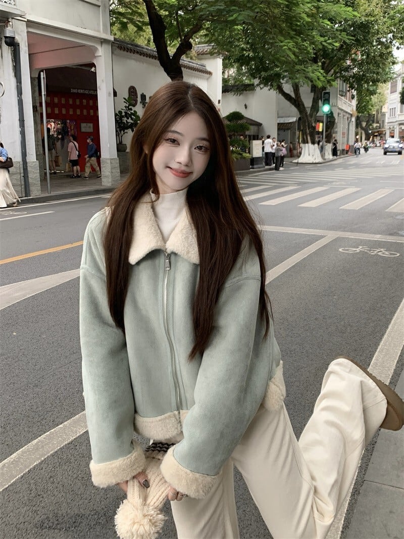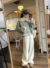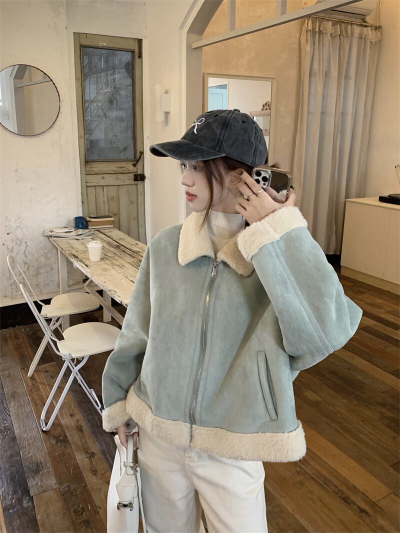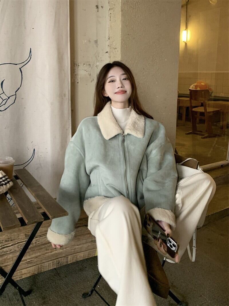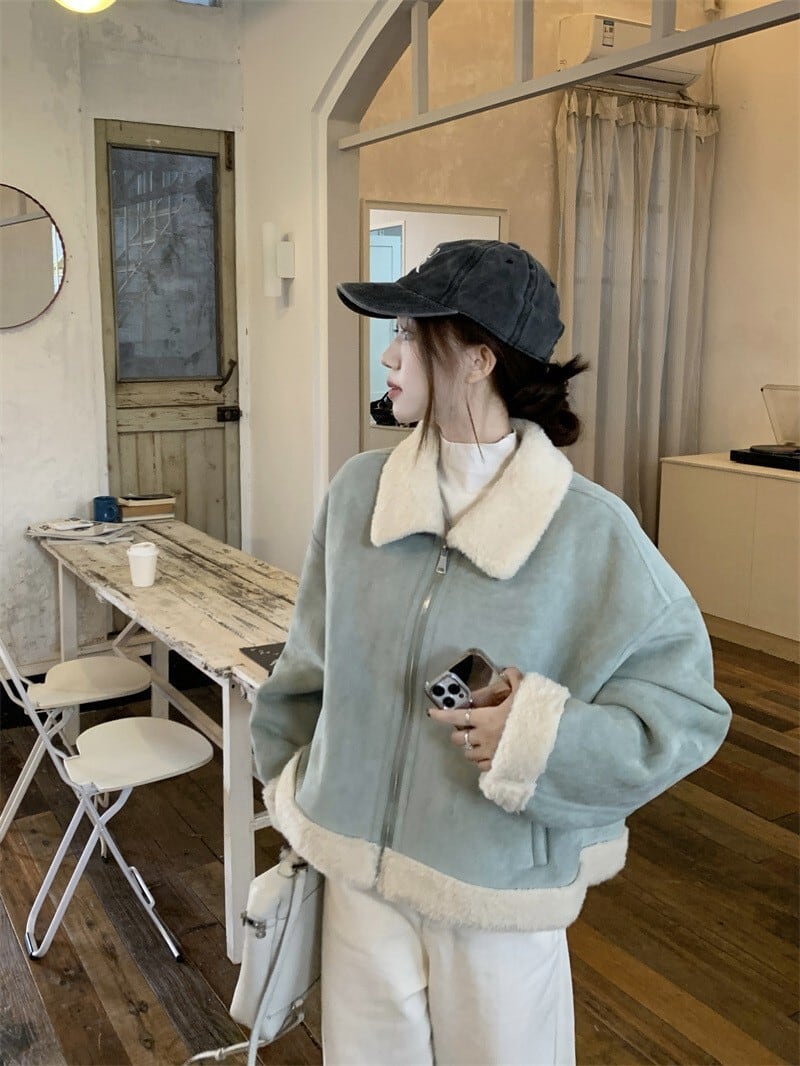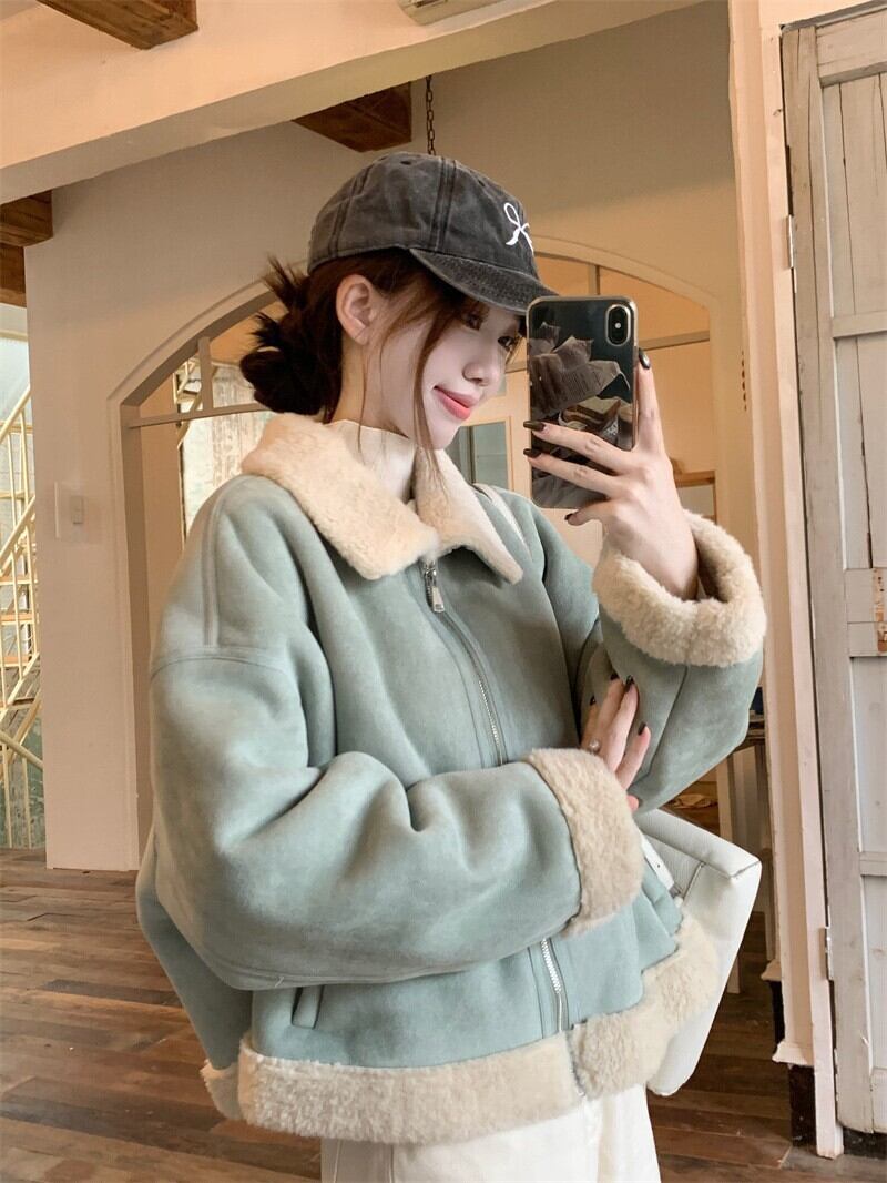 2025冬新作 シープボアジャケット レディース ショート丈 ブルー 韓国風 フェイクムートン アウター ボアコート 可愛い 暖か フェミニン 大人カジュアル