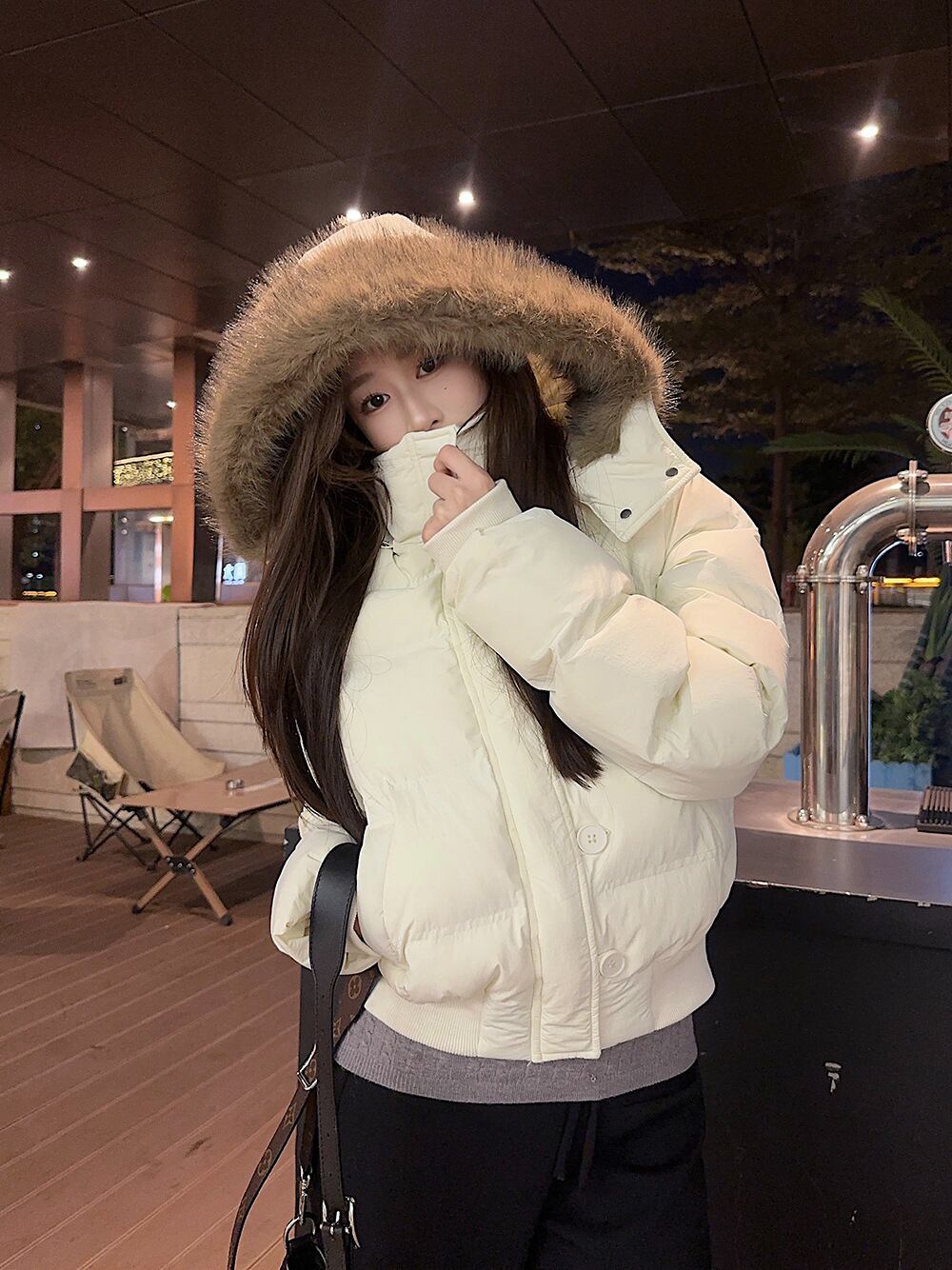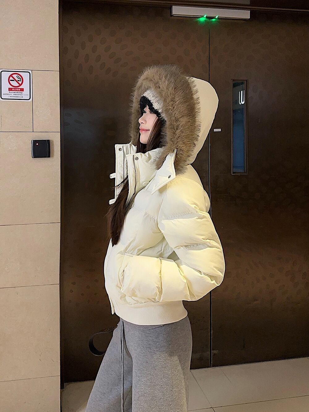 ボリュームのあるフェイクファーフードが顔まわりを華やかに見せ、