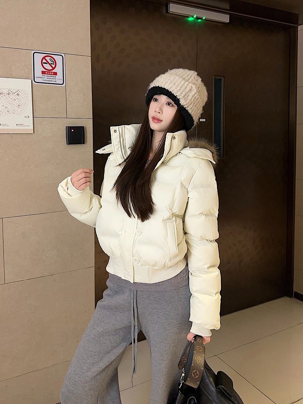 【グリーン】 2025冬新作 中綿ジャケット レディース フード付き フェイクファー ショート丈 あったかアウター 韓国風 カジュアル ネイビー/ホワイト/グリーン
