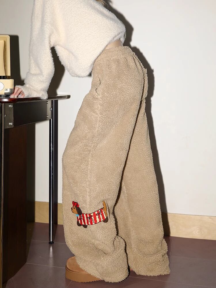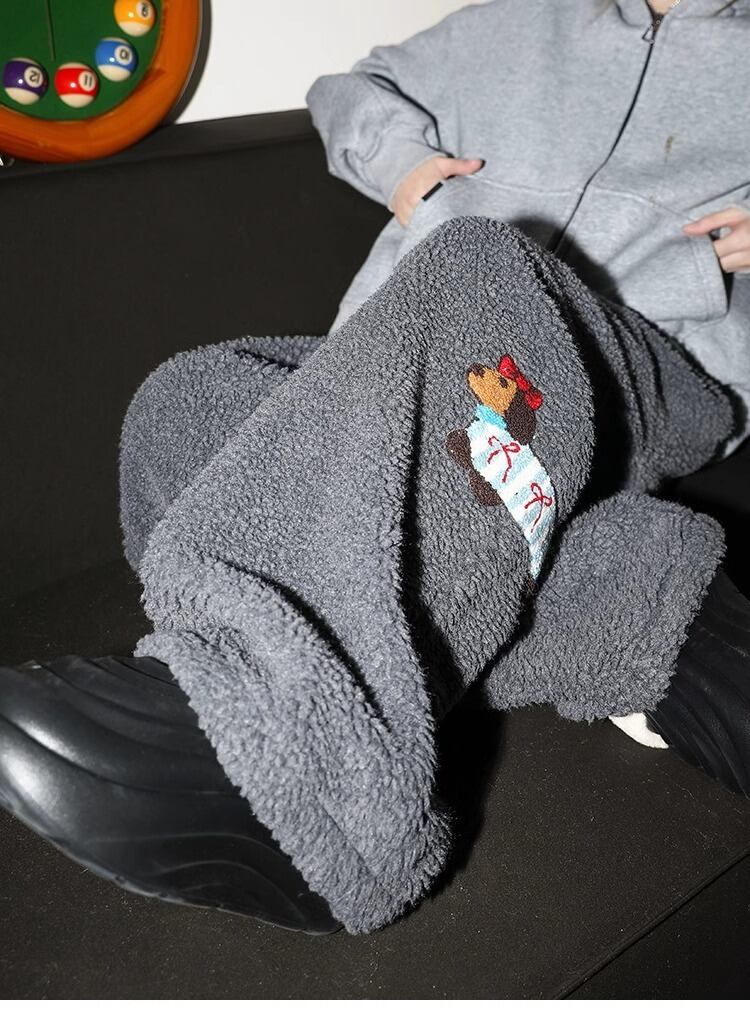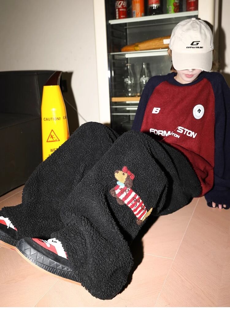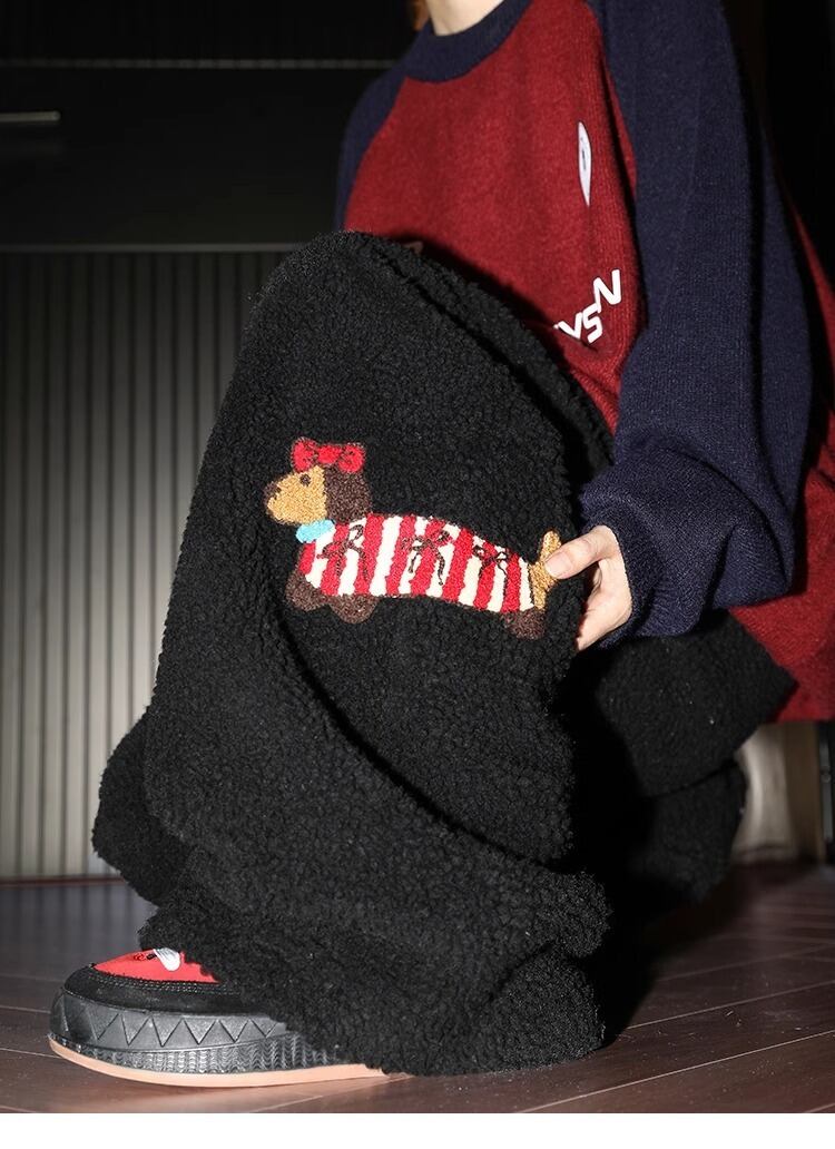 【ブラック】2025冬新作 レディース メンズ フリースパンツ ダックス刺繍 裏起毛 あったか スウェットパンツ ゆったり ワイドパンツ 厚手 ルームウェア カジュアル ボアパンツ 防寒 冬服