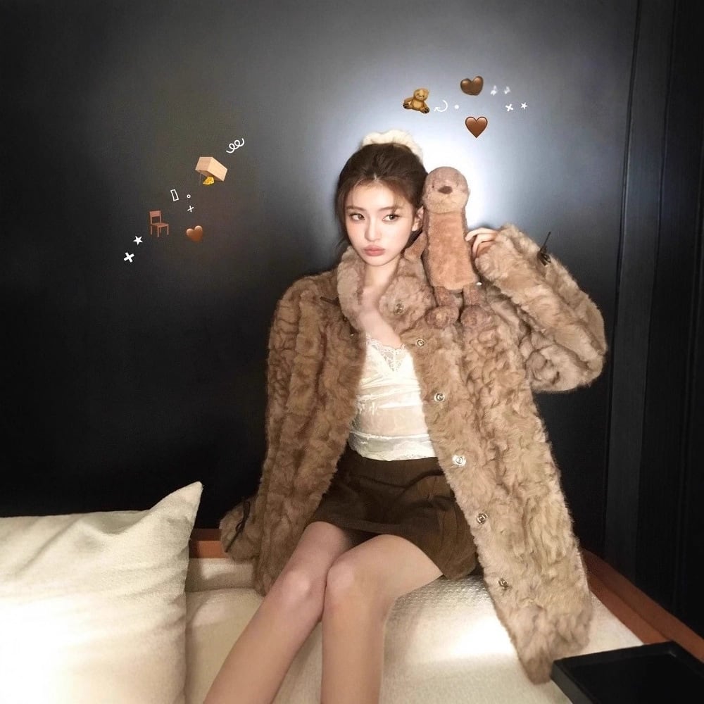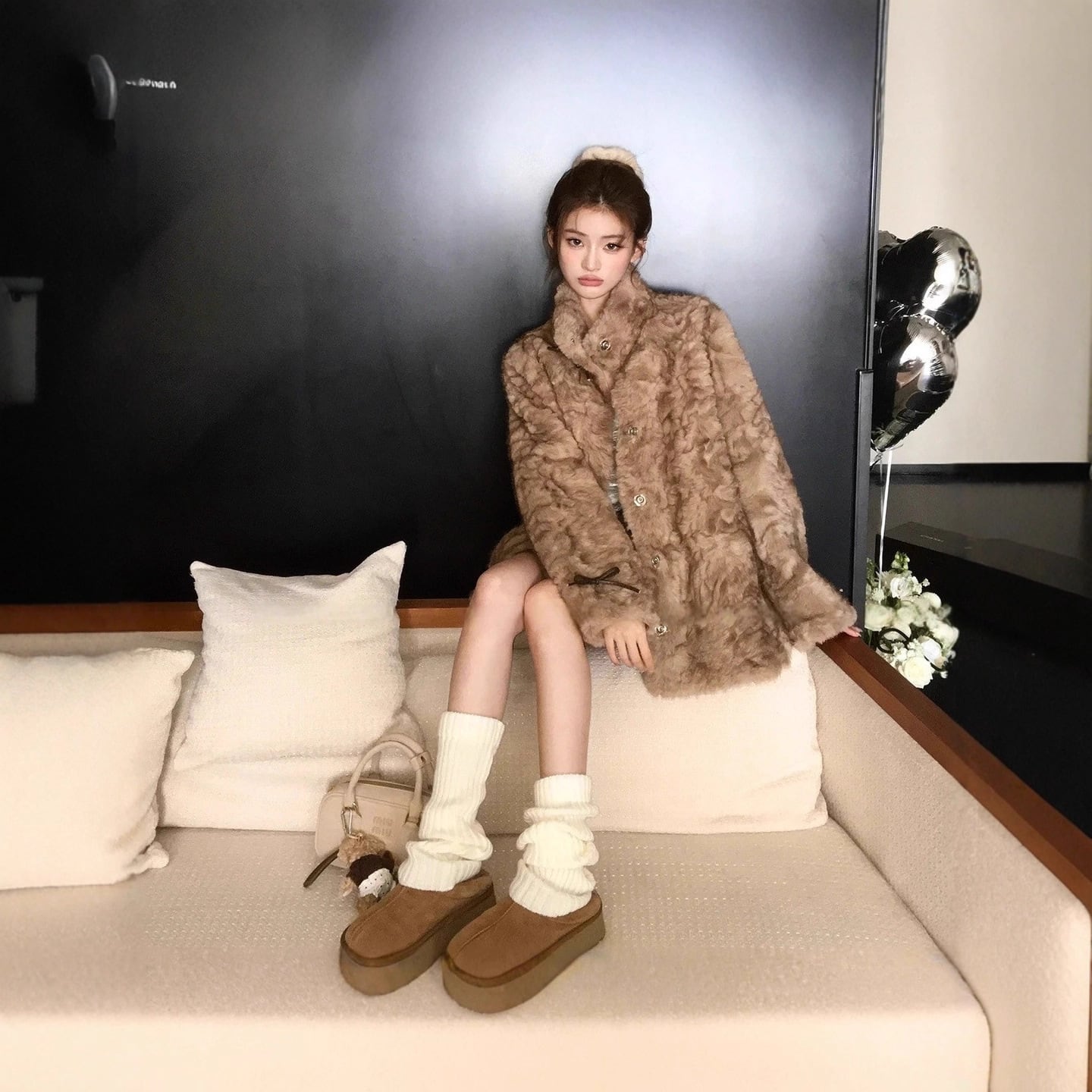 ふわっとした人造皮毛素材が高級感を演出し、モカブラウンの柔らかい色味が落ち着いた大人の印象に。