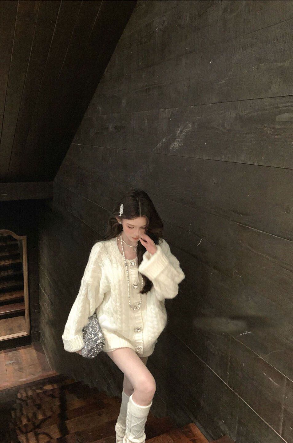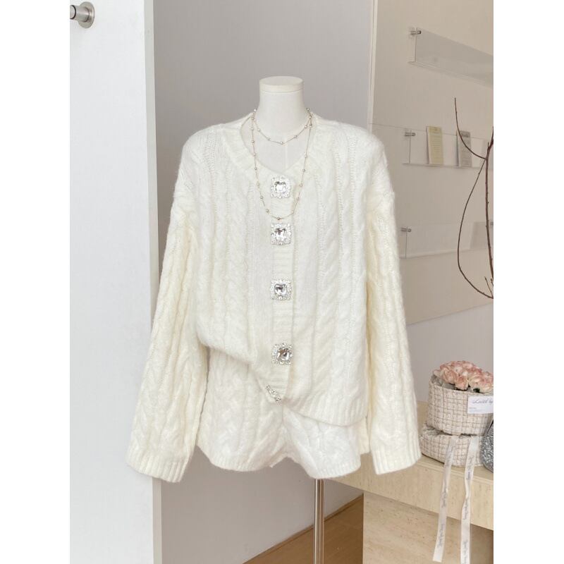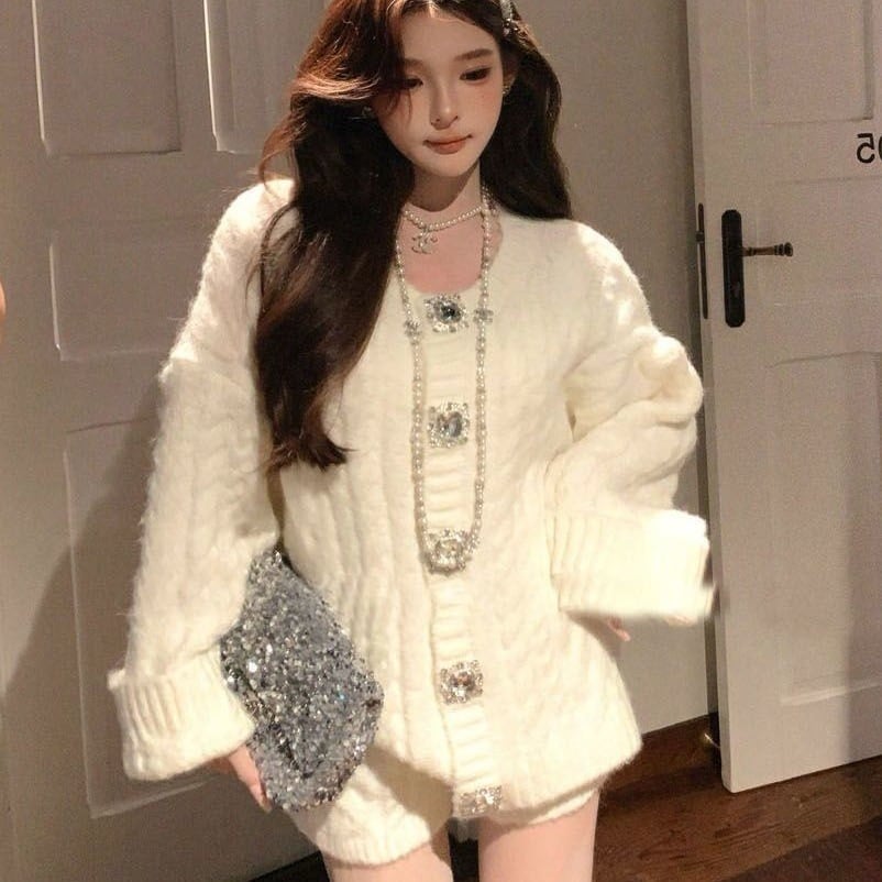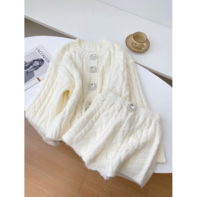 【2025秋新作】ホワイト ニットセットアップ レディース カーディガン+ショートパンツ 清楚系 甘めコーデ 大人かわいい