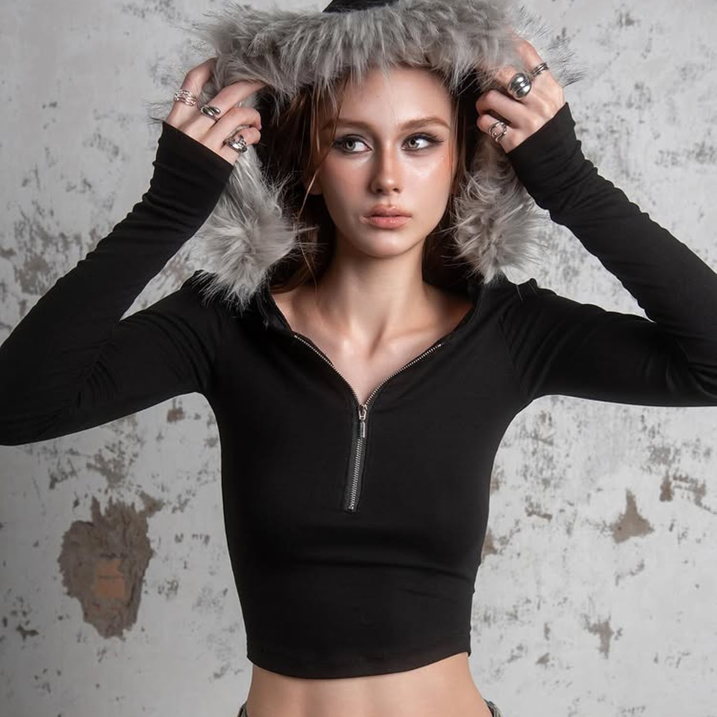 2025秋冬新作 ファー切り替えショートパーカー レディース フード付き 韓国風 ストリートファッション クロップド丈 ジップデザイン