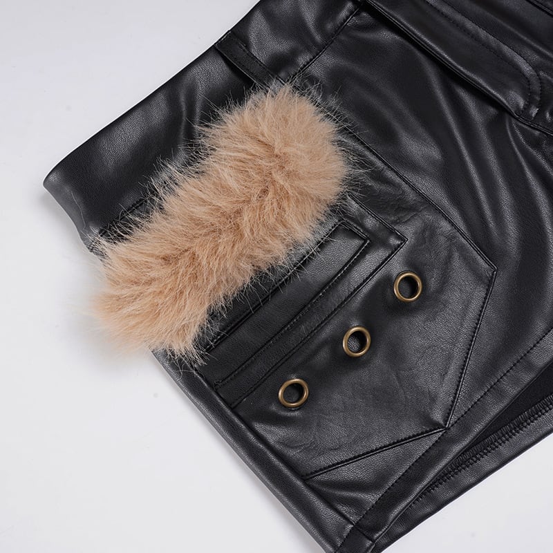 クーポン配布中!実質送料無料になる800円OFFクーポン!決済前にクーポンコード:XMAS800を入力してお得にGetしてね!異素材ミックスが印象的な、フェイクレザー×ファーパネルデザインのショートパンツ。