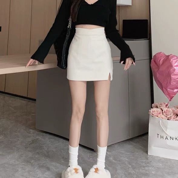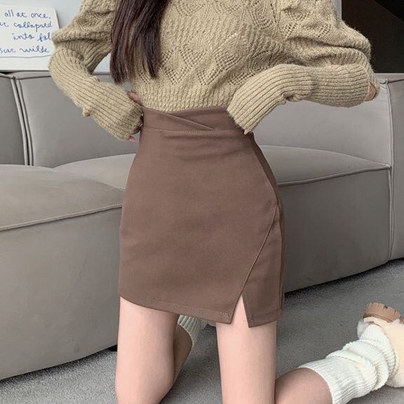 【ブラック】美脚見え ハイウエスト スリット入り ウール調ミニスカート レディース Aライン タイトスカート