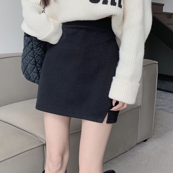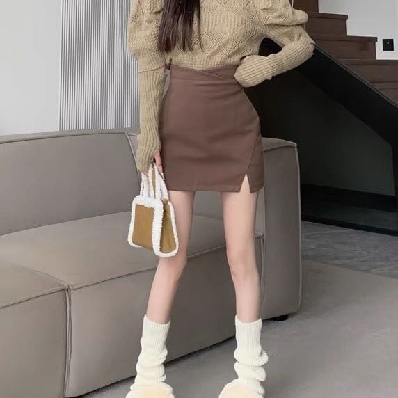 【ブラウン】美脚見え ハイウエスト スリット入り ウール調ミニスカート レディース Aライン タイトスカート