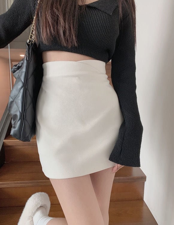 【ホワイト】美脚見え ハイウエスト スリット入り ウール調ミニスカート レディース Aライン タイトスカート