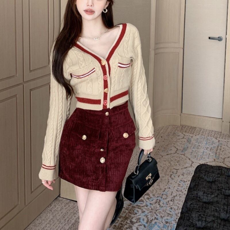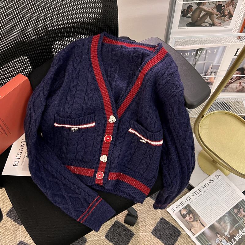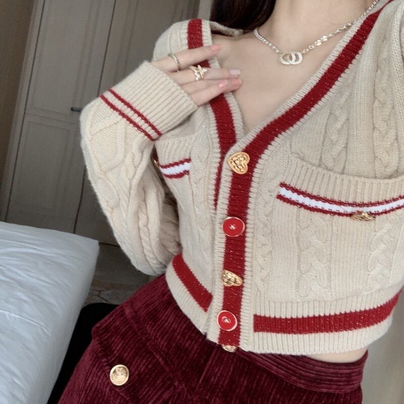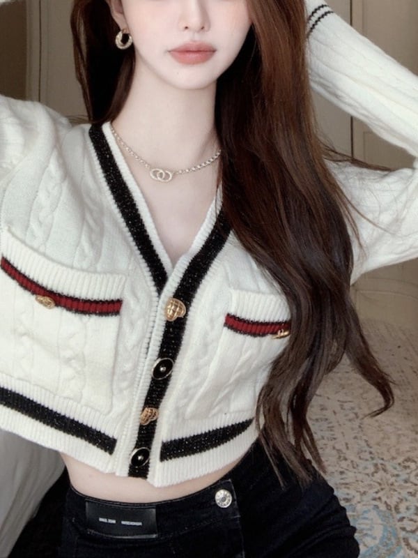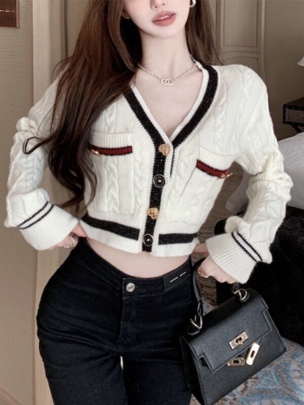 Vネック配色ニットカーディガン|上品見えするショート丈デザイン 春秋新作 レディース