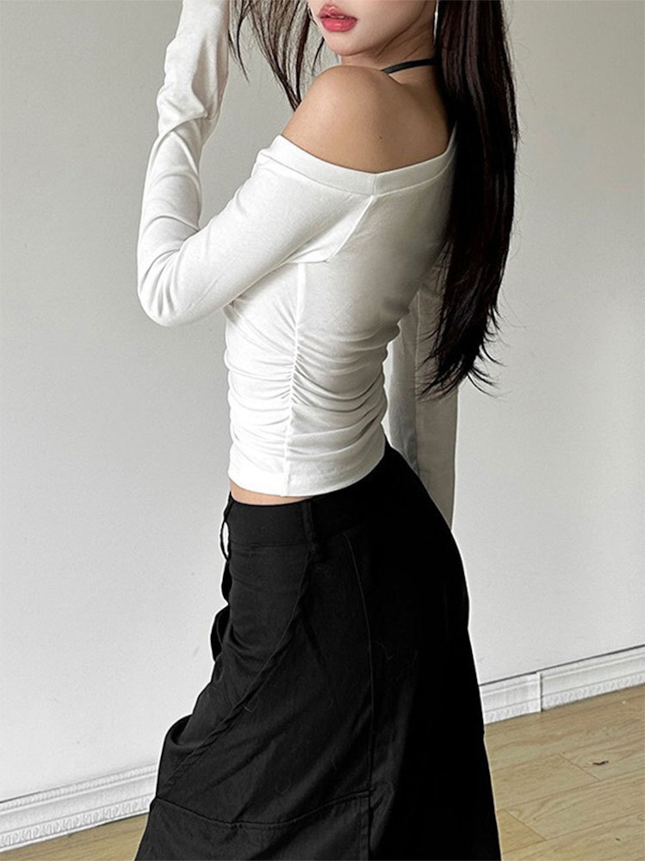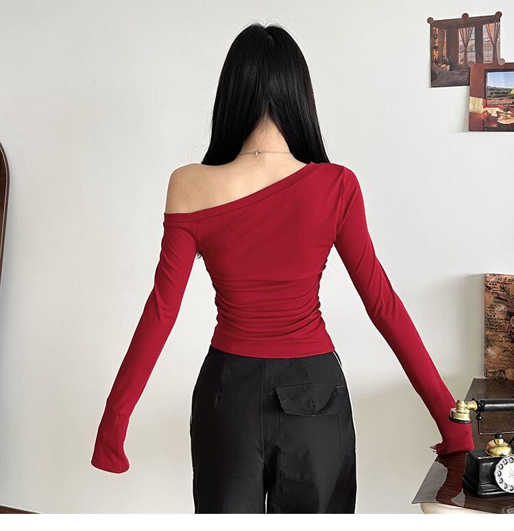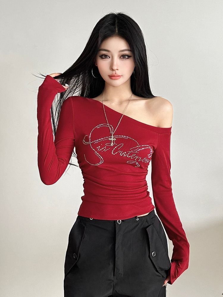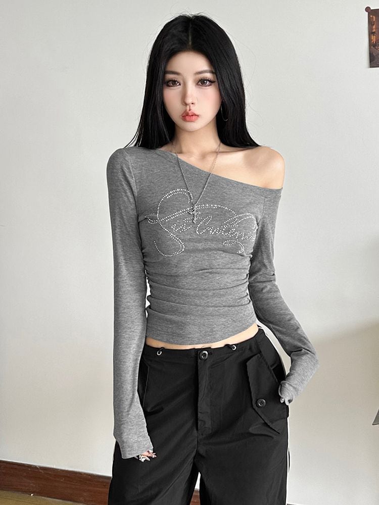 【グレー】ビジュー付きアシメショルダー長袖トップス レディース 秋冬 斜めネック 露肩 韓国風 セクシー タイトTシャツ ショート丈 カジュアル 黒 白 赤 グレー