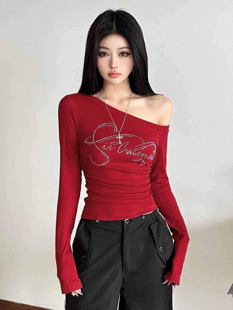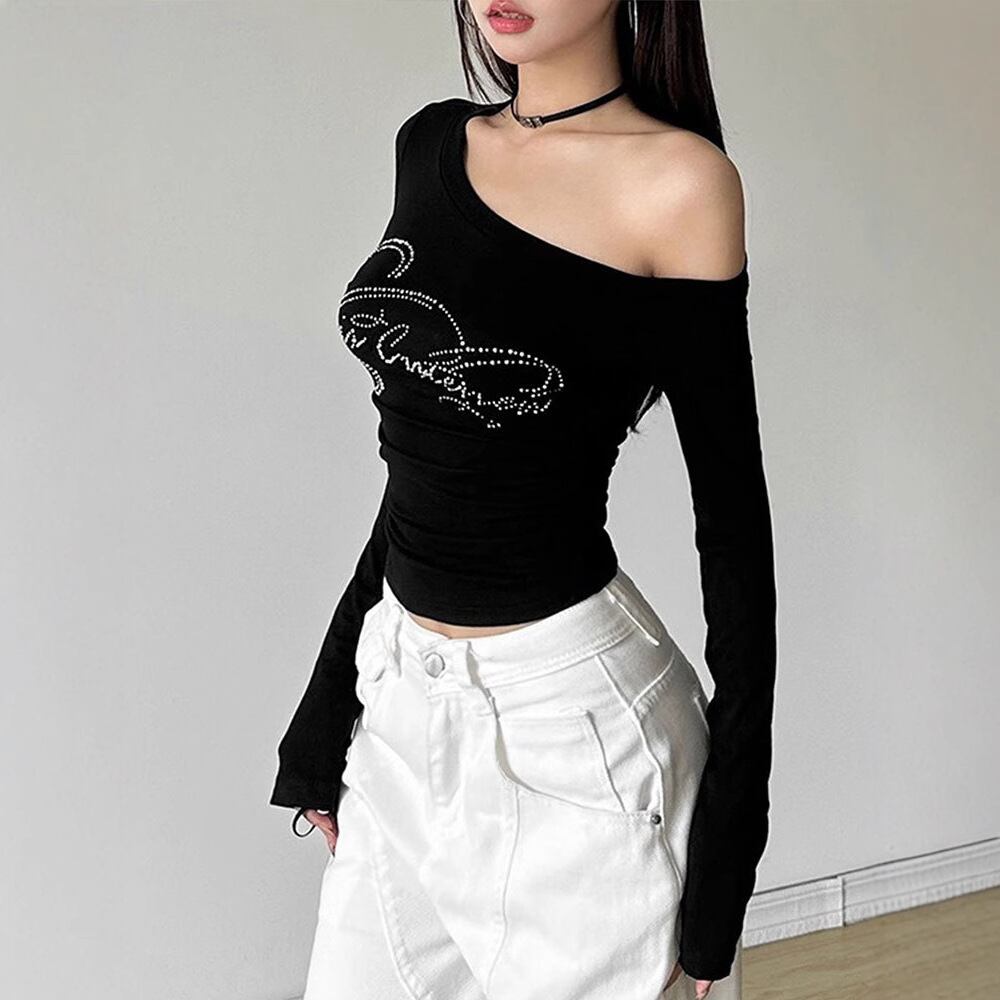 【ホワイト】ビジュー付きアシメショルダー長袖トップス レディース 秋冬 斜めネック 露肩 韓国風 セクシー タイトTシャツ ショート丈 カジュアル 黒 白 赤 グレー