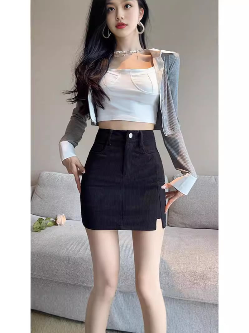 【アイボリー】ハイウエスト コーデュロイタイトスカート レディース 冬新作 韓国ファッション スリット入り 美脚見え ミニ丈 台形 一歩スカート XS〜XL