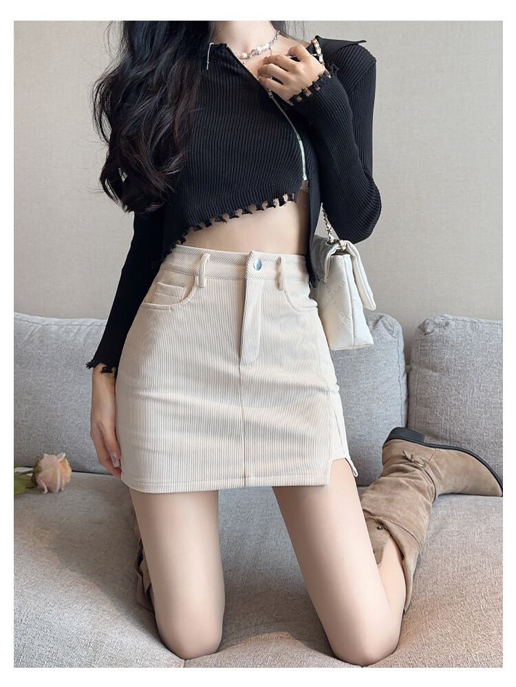【ブラウン】ハイウエスト コーデュロイタイトスカート レディース 冬新作 韓国ファッション スリット入り 美脚見え ミニ丈 台形 一歩スカート XS〜XL