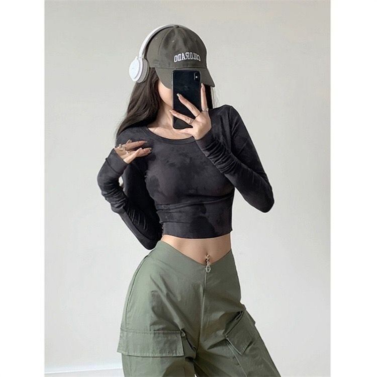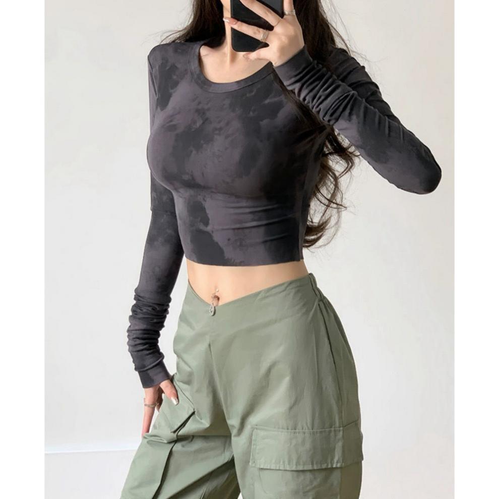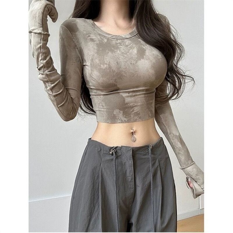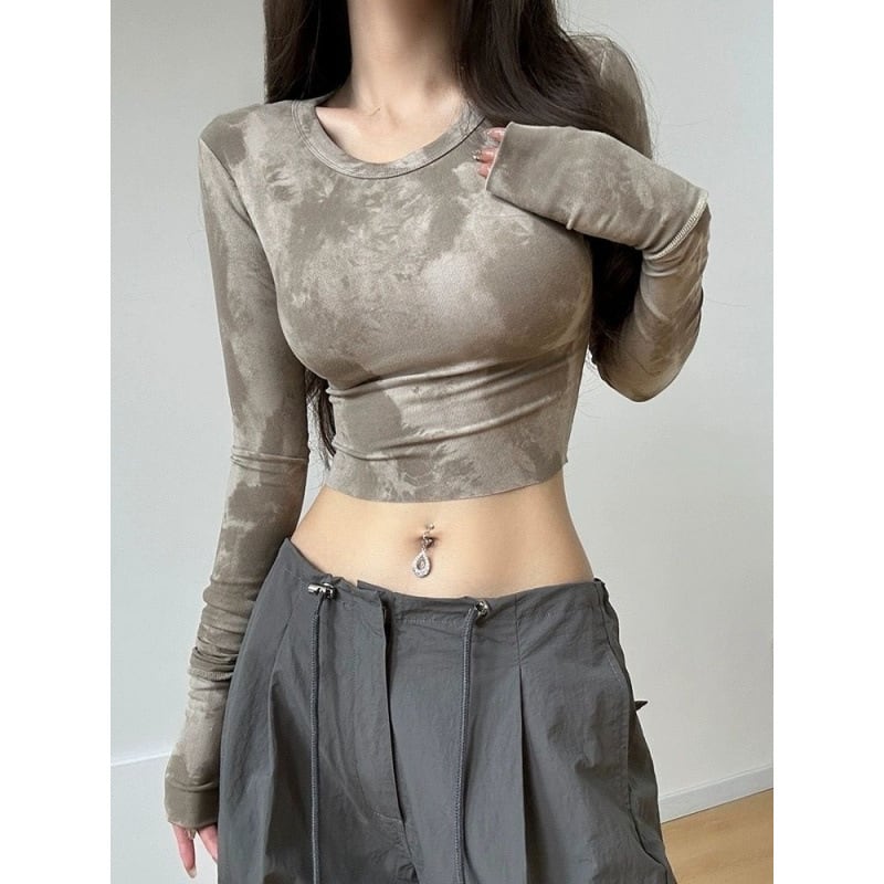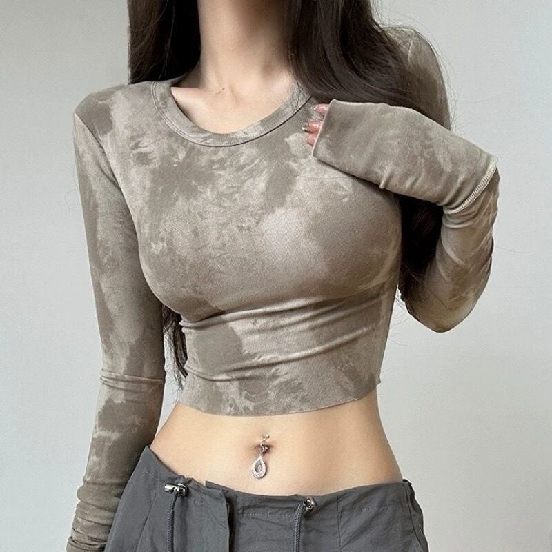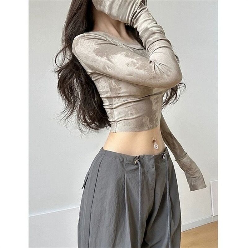 【グレー】マーブル柄 タイダイ 長袖トップス レディース 立ち襟 タイトフィット Y2K ギャル系 伸縮カットソー インナーにも使えるショート丈カットソー 全2色 S?XL