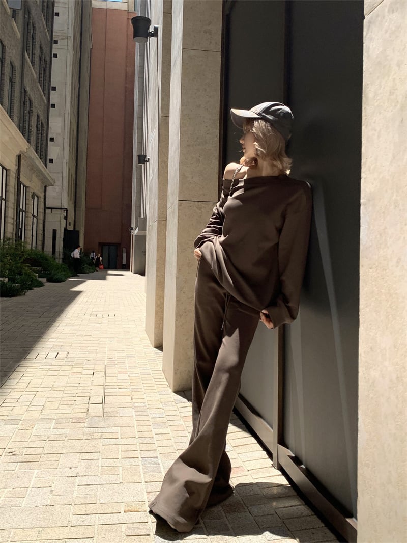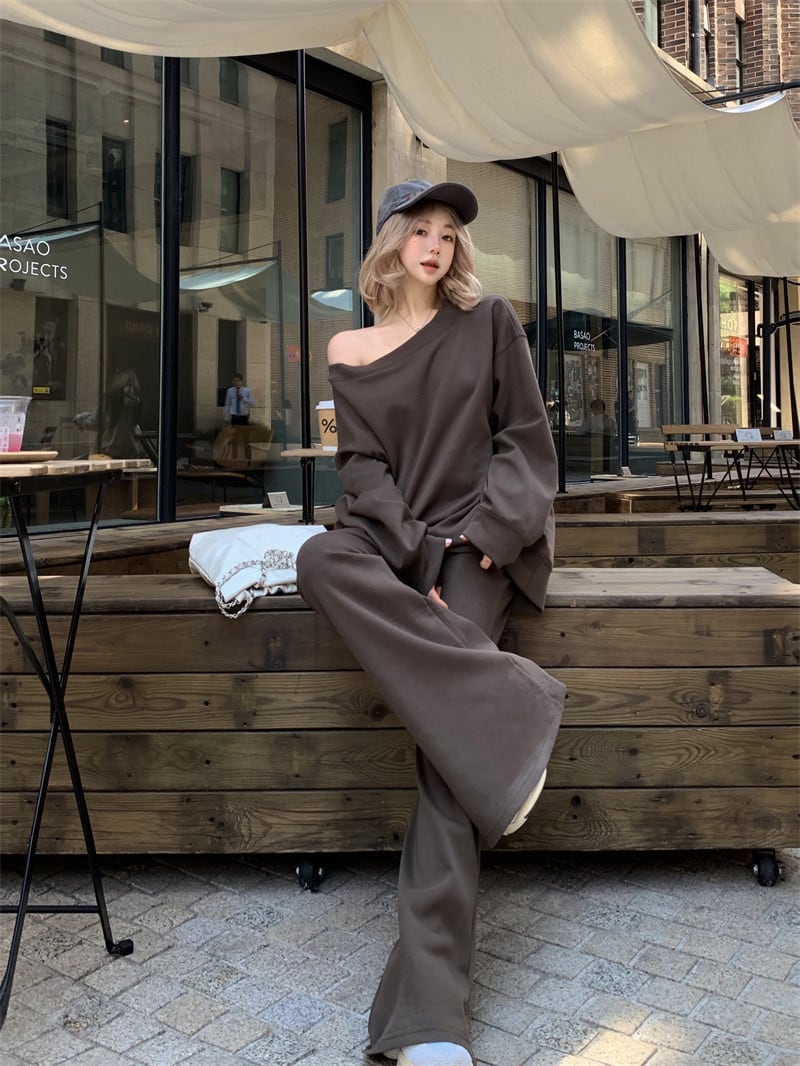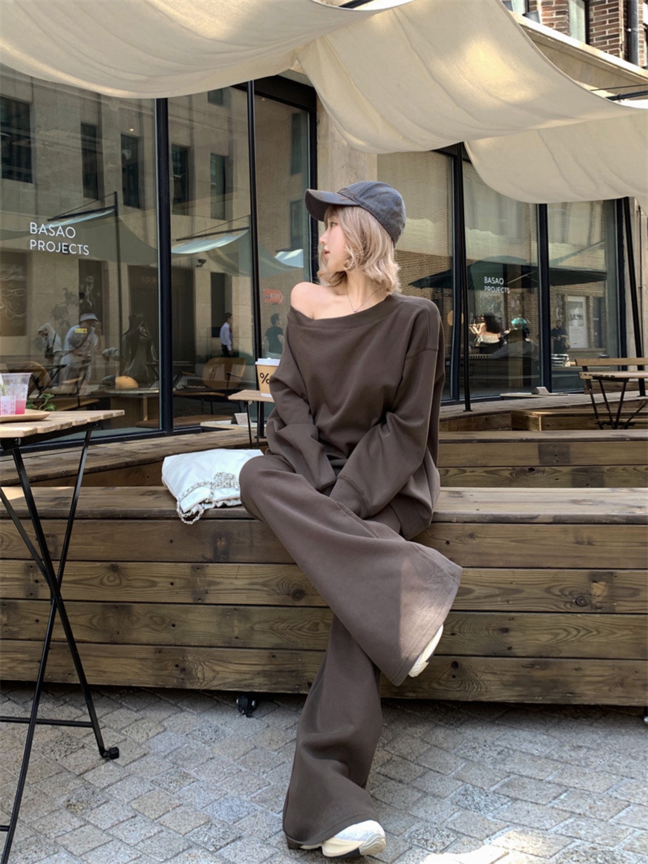 【ブラウン】セットアップ 斜めワンショルダー スウェット上下 レディース 美式カジュアル 韓国ゆるコーデ 長袖トップス+フレアパンツ 体型カバー ストリート風 2点セット S?XL