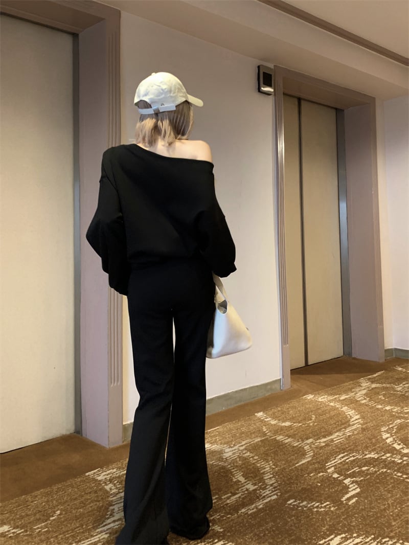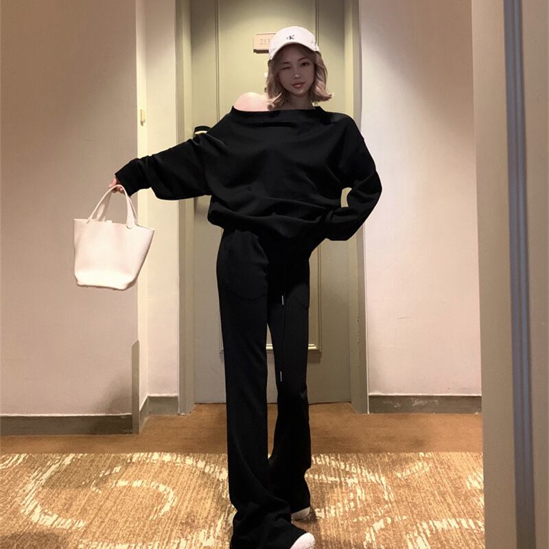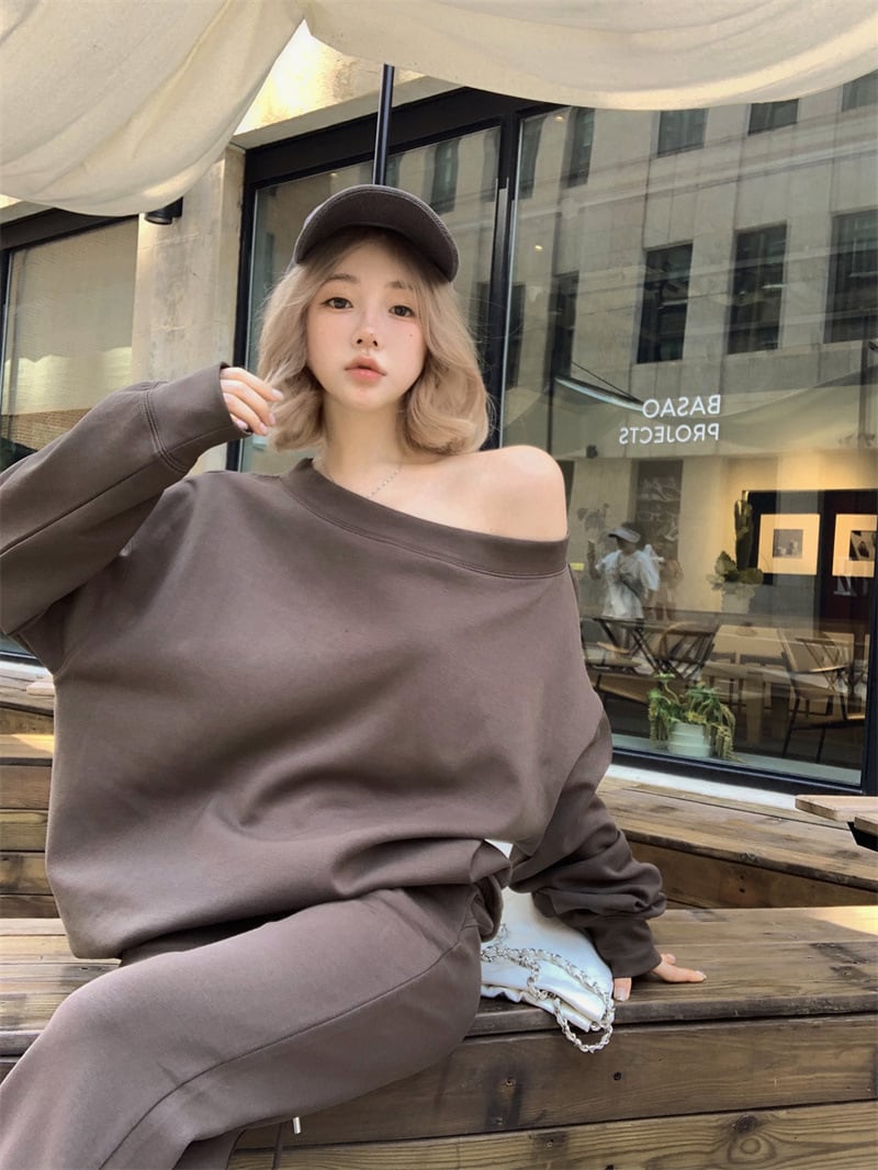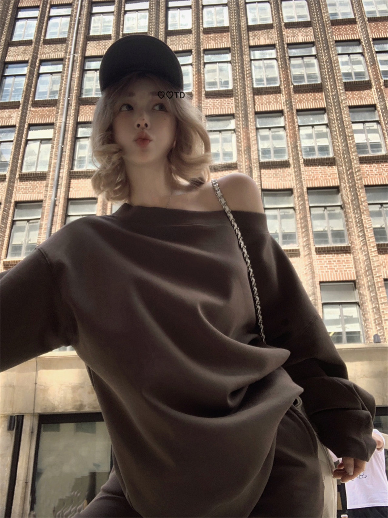 【ブラウン】セットアップ 斜めワンショルダー スウェット上下 レディース 美式カジュアル 韓国ゆるコーデ 長袖トップス+フレアパンツ 体型カバー ストリート風 2点セット S?XL