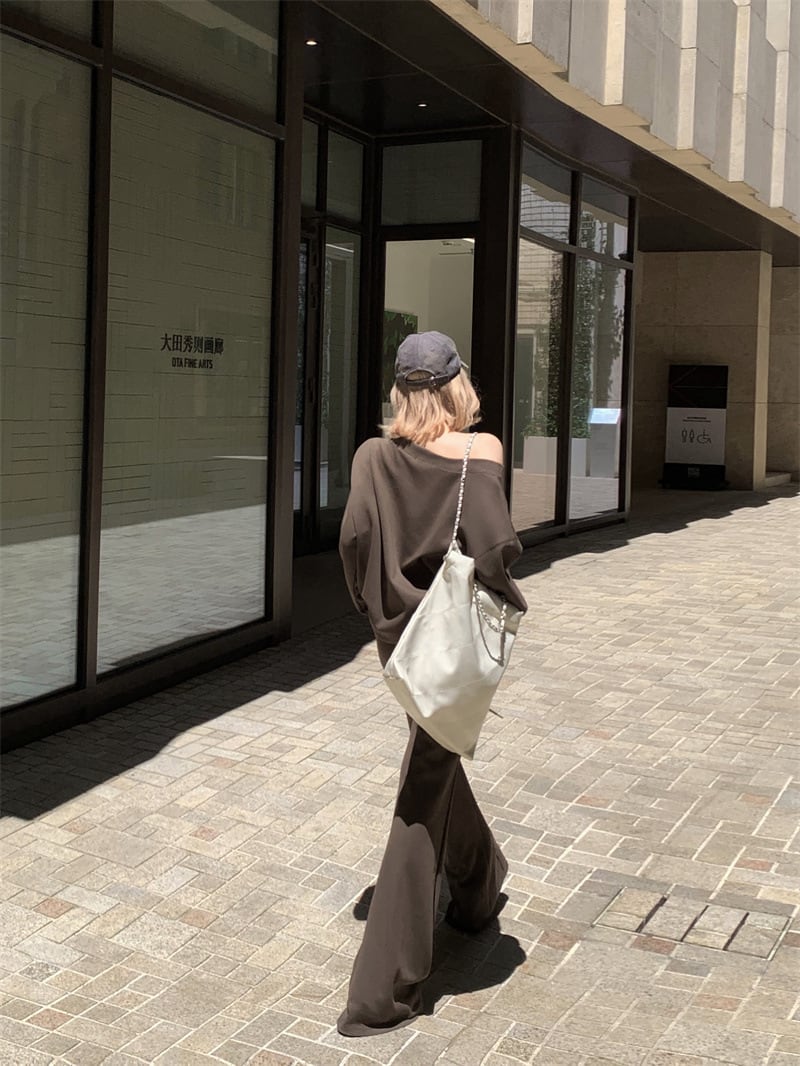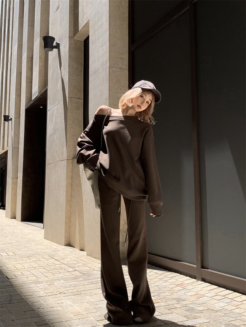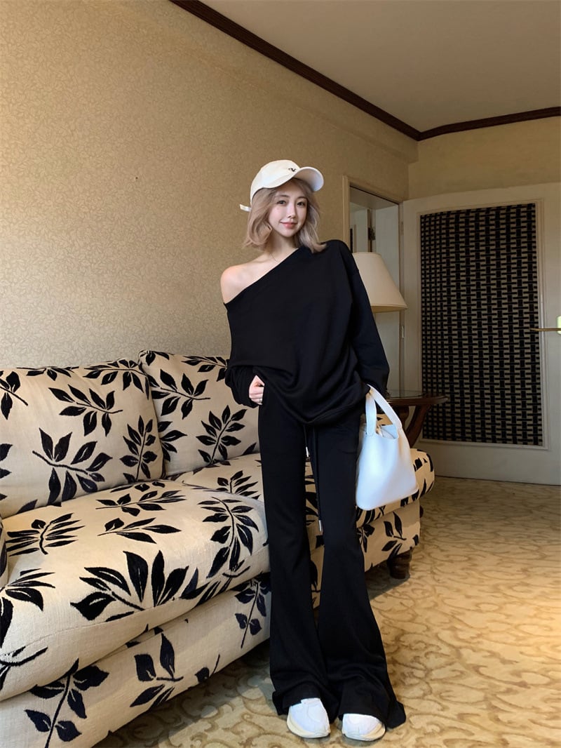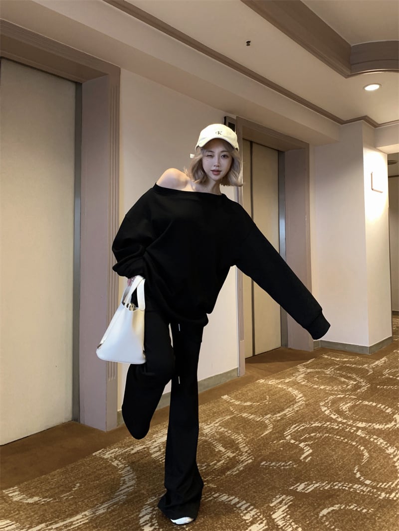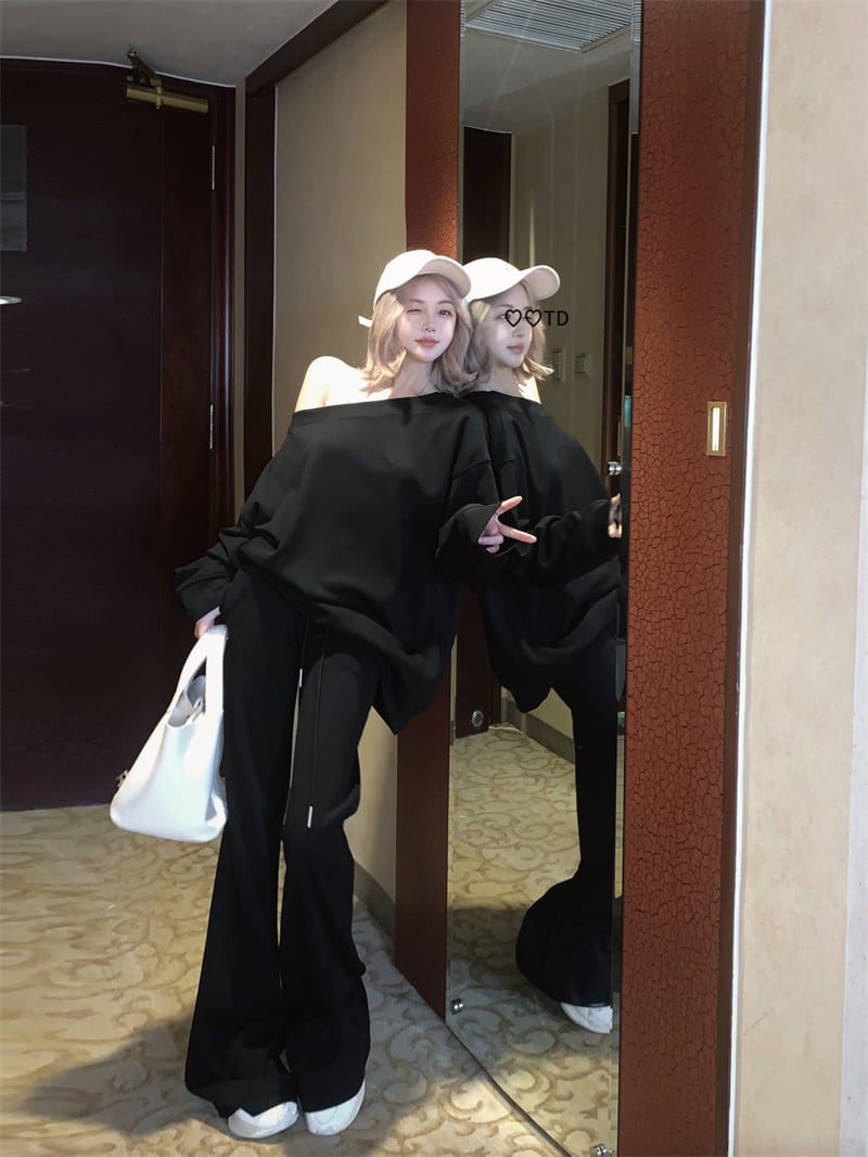 【ブラック】セットアップ 斜めワンショルダー スウェット上下 レディース 美式カジュアル 韓国ゆるコーデ 長袖トップス+フレアパンツ 体型カバー ストリート風 2点セット S?XL