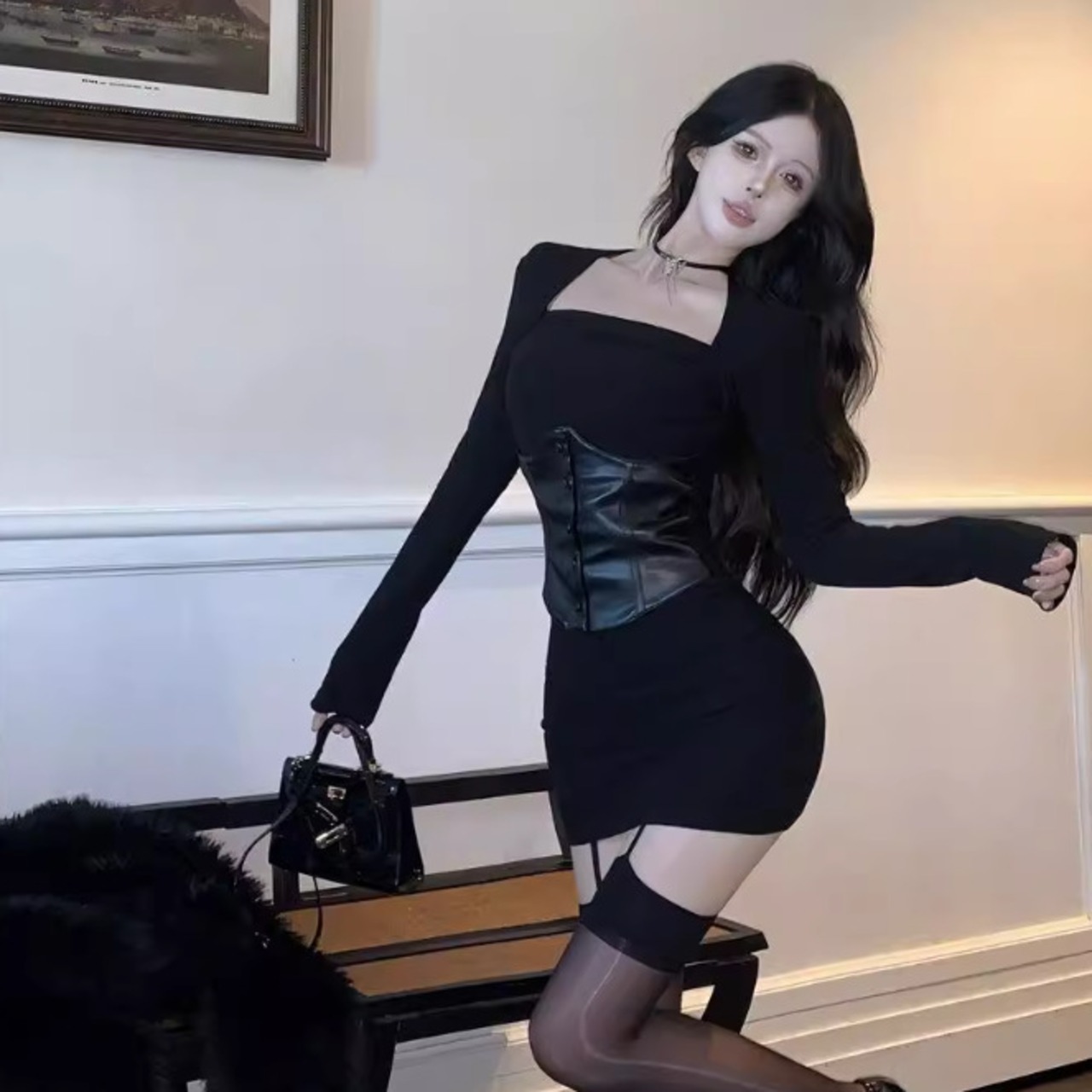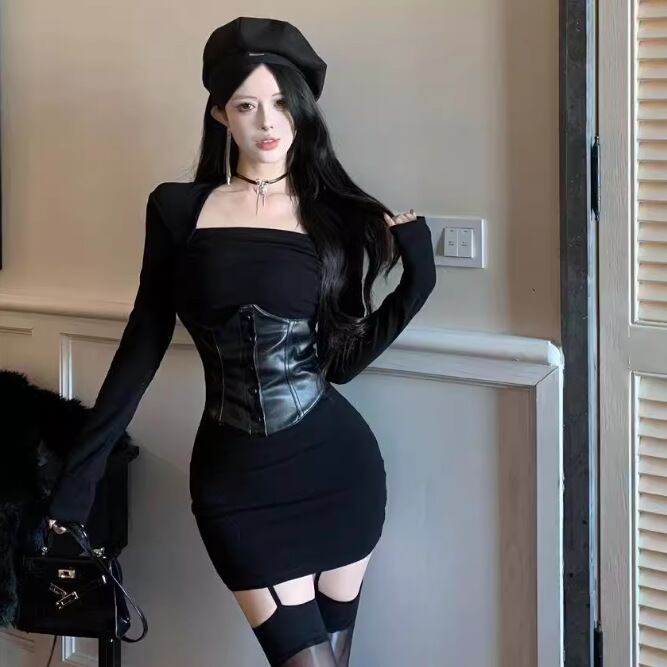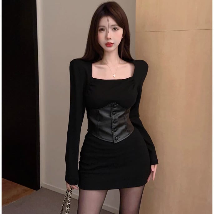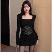 【冬新作】タイトワンピース レディース 長袖 ミニ丈 スクエアネック セクシー コルセット付き くびれ強調 韓国風 小柄さんにも◎ ブラック ワンピース