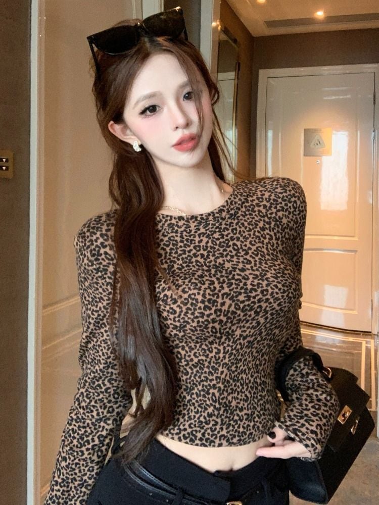 レオパード柄 長袖ショートTシャツ レディース 秋冬 タイト ショート丈 裏起毛 セクシー クロップドトップス